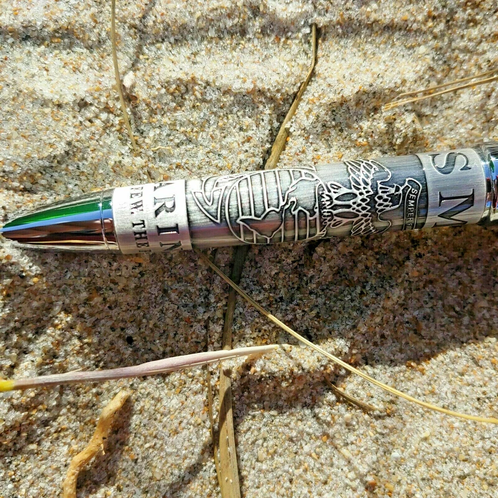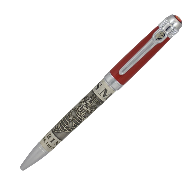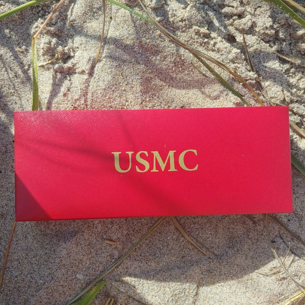 Description: US Marines Ballpoint Pewter Pen Gift Set Beautiful Navy base with Pewter inlay, rich feeling, heavy weight premium pen. Gift boxed stainless steel and pewter ball point pen has tons of detail. The top of the pen is red with a full color Marine Corp emblem end cap. Main body of the pen barrel features the Eagle, Globe & Anchor etched into steel body, along with "USMC" and "The Few. The Proud." The silver clip has gold Eagle, Globe & Anchor detail, with matching textured silver accent coupler rings to finish the detailed look. Large Size Cross Style Black Ink Refill Included 5 1/2" overall Beautifully crafted set Officially Licensed Marines logo on both the pen and gift box Twist cap to reveal / hidden ballpoint tip Great Gift for a Service Member or a Veteran! Condition: Brand New BP194 RD