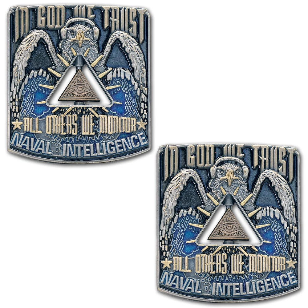 US NAVY Naval Intelligence Spinner Challenge Coin NAVY HONOR: Celebrate your Navy service or that of a loved one with this veteran challenge coin. A symbol of honor and achievement in the armed forces, it's a cherished gift for sailors and Marines alike. PROUDLY AMERICAN-MADE: Our military challenge coins are designed and produced in the USA, reflecting our commitment to quality and patriotism. VETERAN-OWNED SMALL BUSINESS: We are a US veteran-owned small business with over 35 years of military design experience. Our coins are crafted with precision and a deep understanding of the military's traditions and values. PRESERVE YOUR MILITARY LEGACY: These challenge coins are not just tokens; they are keepsakes that preserve your military career and accomplishments for generations to come. Our 4mm thick, highly defined coins are built to last and become cherished family heirlooms. OFFICIALLY LICENSED: Our coins are licensed by the US military trademark and licensing departments, ensuring they meet the highest standards for both professionalism and quality. A portion of each sale goes to support military morale, welfare, and recreation programs.