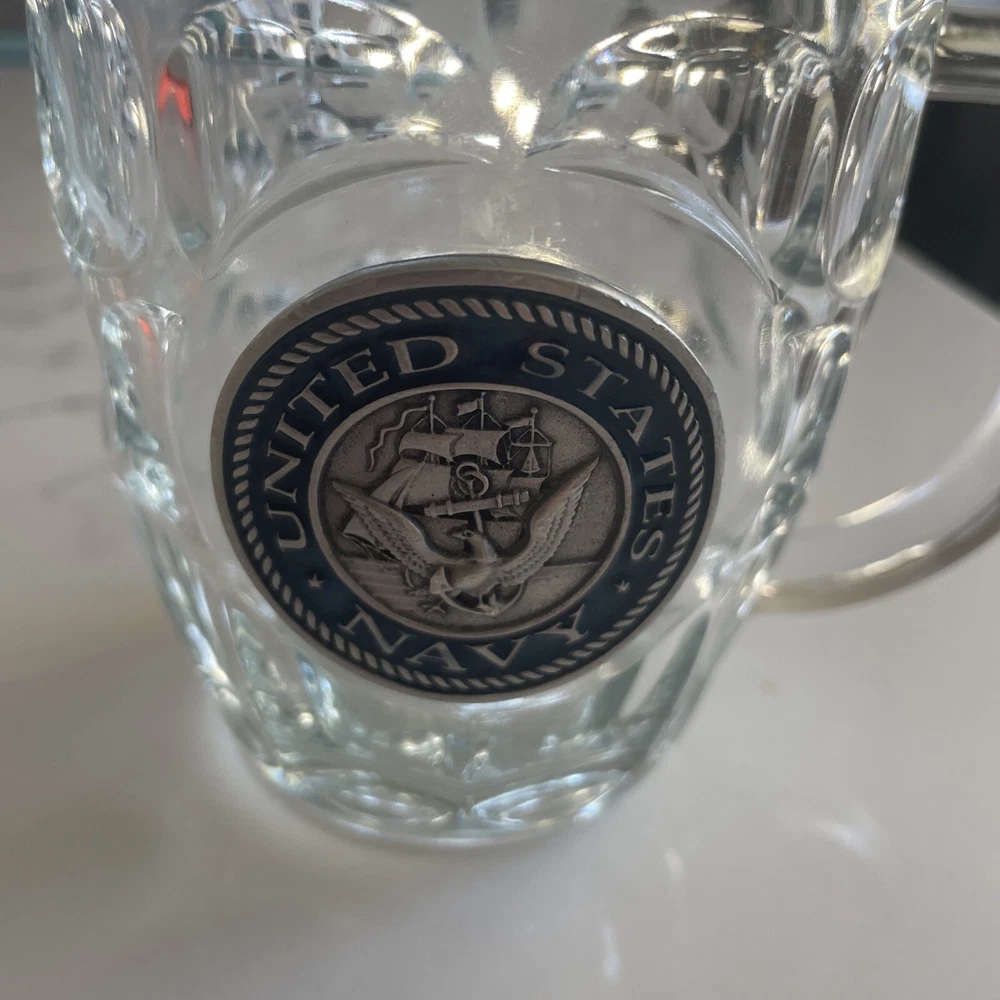 US Navy Pewter Logo on Clear Glass Beer Stein Mug Military Luminarc USA
