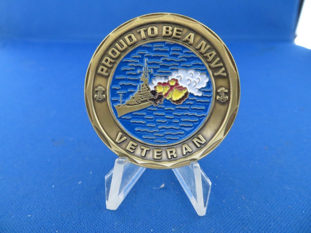 For your consideration is a challenge coin honoring are Navy Veterans. It measures 1 5/8 inches in diameter. On one side it depicts a naval carrier with United States Navy Veteran on the reverse Proud To Be A Navy Veteran. Overall condition is excellent. What you see is what you get. I SHIP VIA UNITED STATES POST OFFICE AND PROVIDE DELIVERY CONFIRMATION NUMBER UPON SHIPPING, IF THIS IS A PROBLEM PLEASE ADVISE. I'm all about customer satisfaction so if there is a problem please contact me first. Insurance is not provided, so If you want your item insured please advise and I'll add it to your invoice. I leave feedback after feedback has been received. Purchases are to be paid for within seven (7) days. Thank you for looking and good luck.