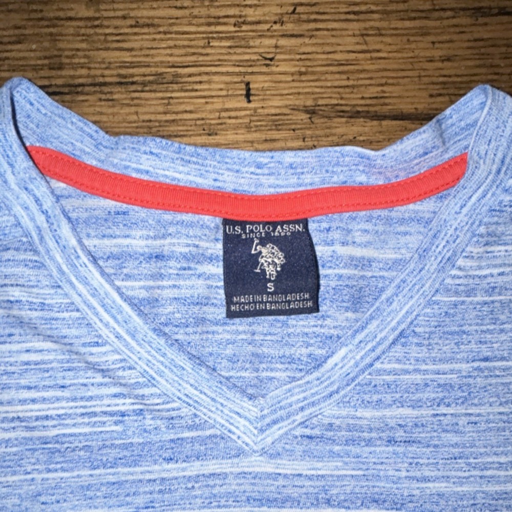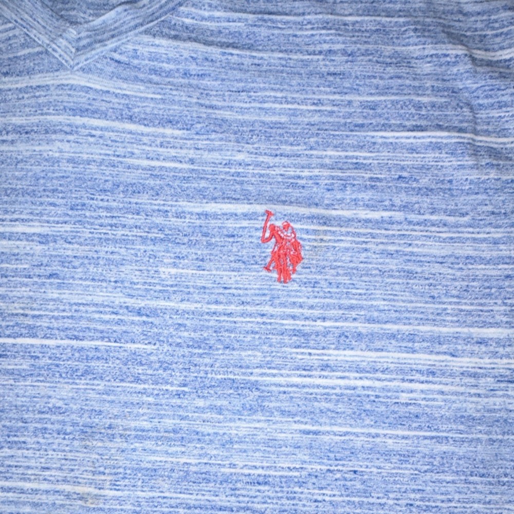 The U.S. Polo Assn. Men's V-Neck Striped Blue White Logo Short Sleeve T-Shirt in size S is a stylish and classic addition to any man's wardrobe. The shirt features a blue and white striped pattern with a subtle logo accent, a comfortable regular fit, a flattering V-neckline, and short sleeves, making it perfect for both casual and semi-casual occasions. Made from high-quality materials, this t-shirt is sure to provide both comfort and style for the modern man.