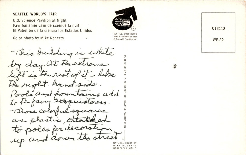 MAKE AN OFFER. THE MORE YOU BUY THE BETTER DEAL I WILL ACCEPT The postcard features a color photo of the U.S. Science Pavilion at the Seattle World's Fair, also known as the Century 21 Exposition, which took place from April 21 to October 21, 1962. The pavilion is depicted at night, with its white exterior illuminated.