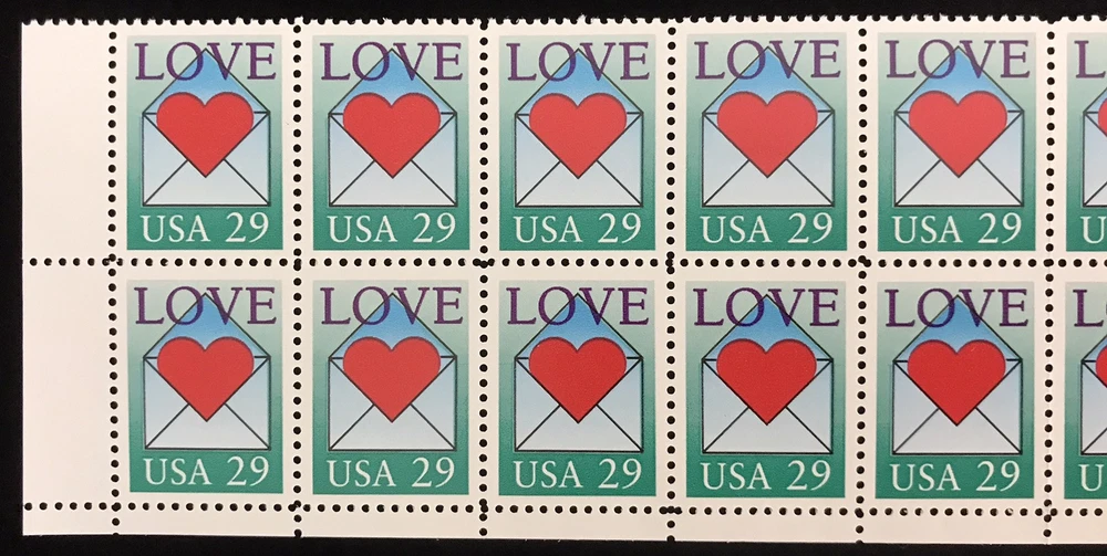 US Stamp Scott #2618, 29c, Love Issue, Heart / Envelope 2x10 Block (20 Stamps) Nice condition. See pictures for details.