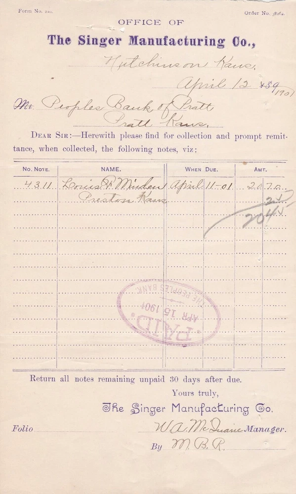 U.S. The SINGER MANUFACTURING CO, Hutchinson, Kansas. 1901 Paid Invoice Rf 45381