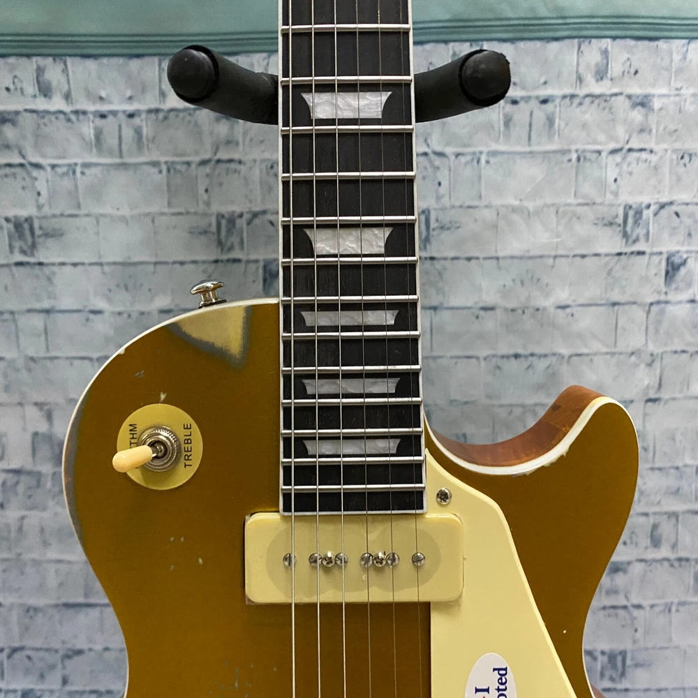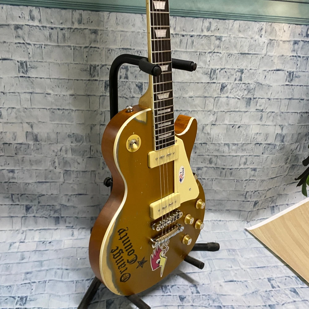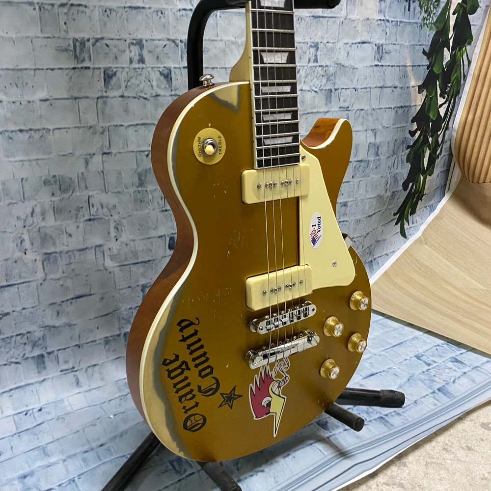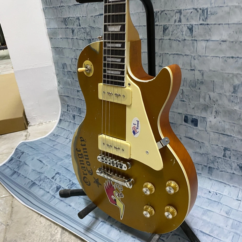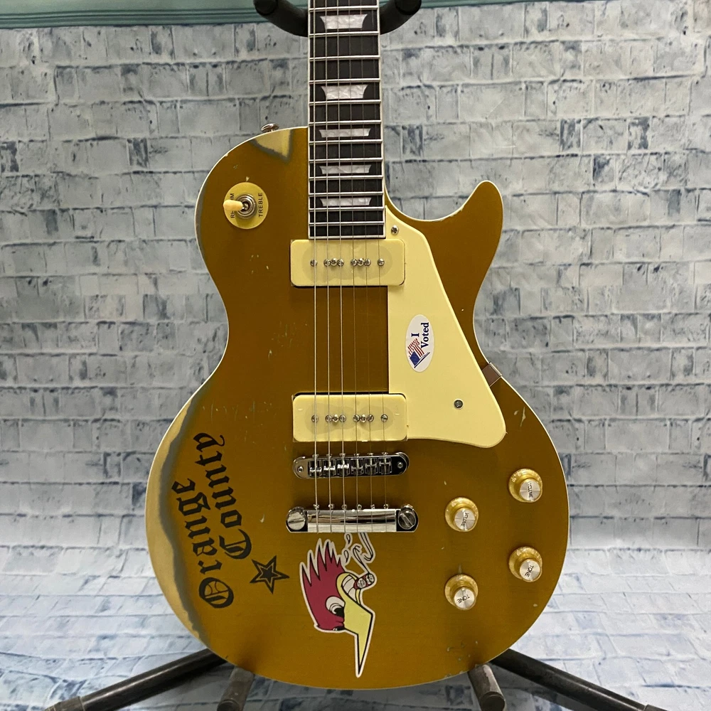 This is a US WAREHOUSE Mike Ness 1976 Deluxe electric guitar in Aged Gold Relics finish. It has a solid Mahogany body and neck, with a Rosewood fretboard and 22 frets. This right-handed guitar features a 6-string configuration and comes with a cable. The model year is 2024 and it is part of the Standard series, suitable for professional level performance. Made in China, this Custom model is a high-quality electric guitar for musicians.