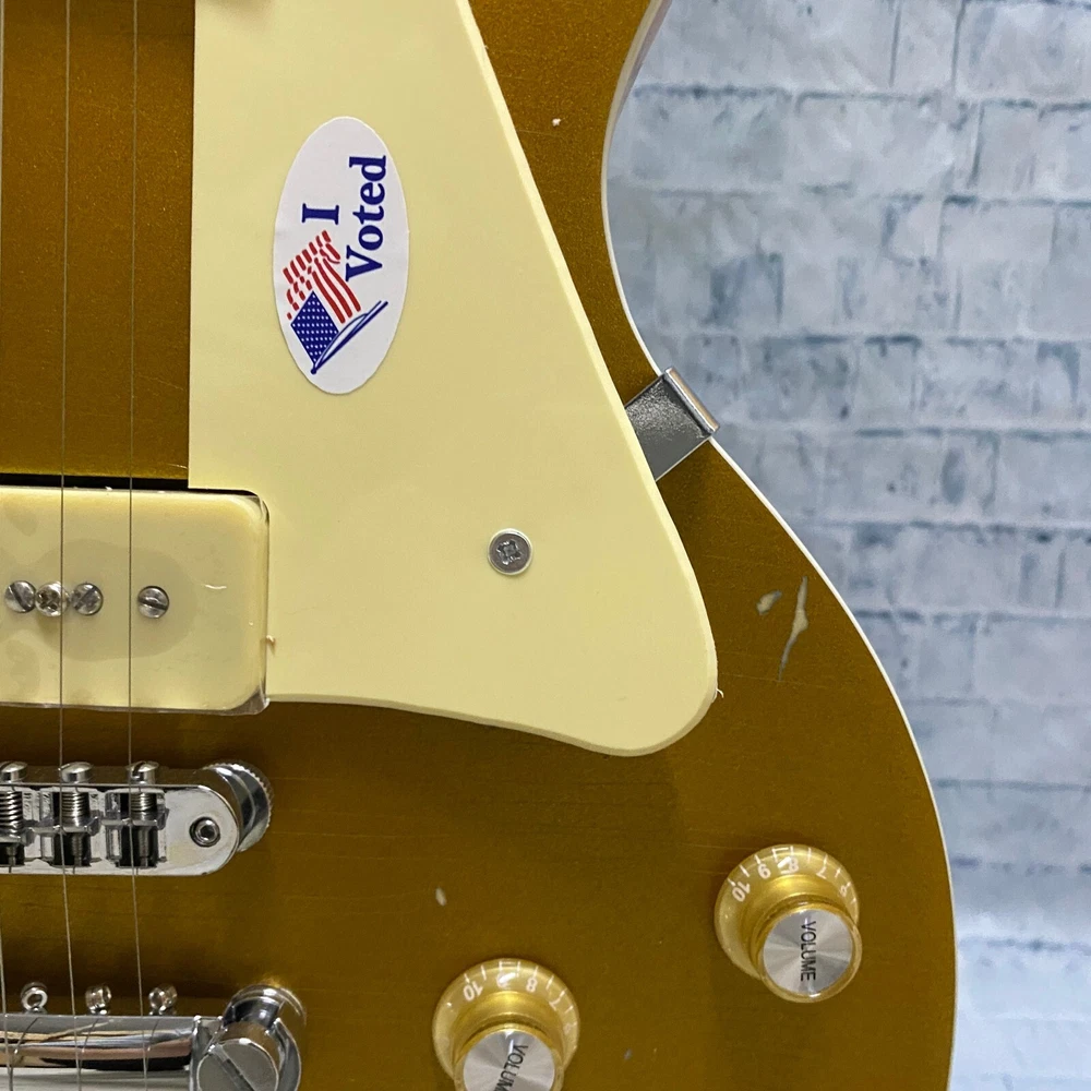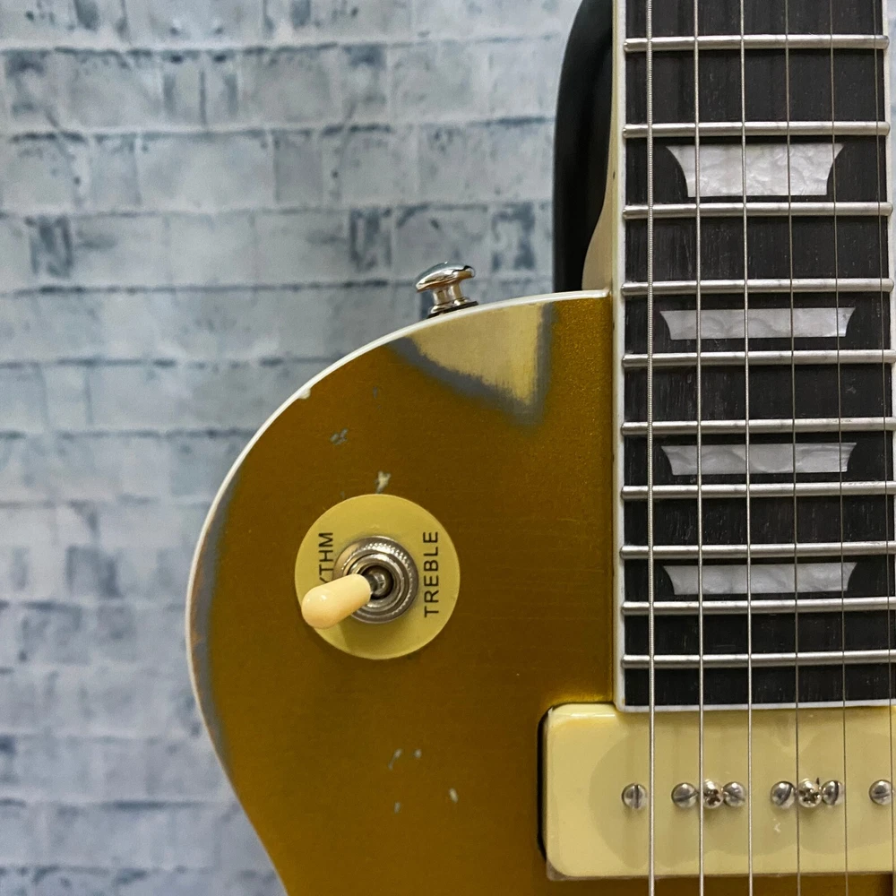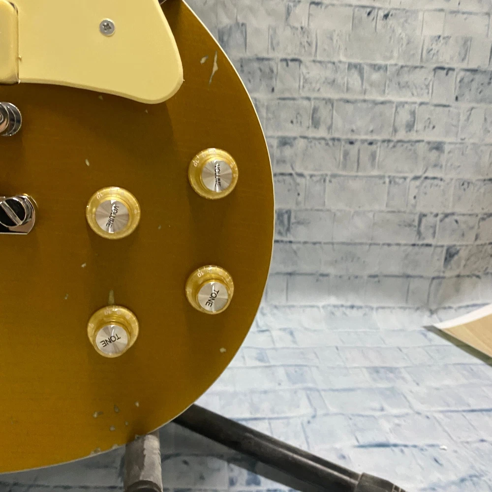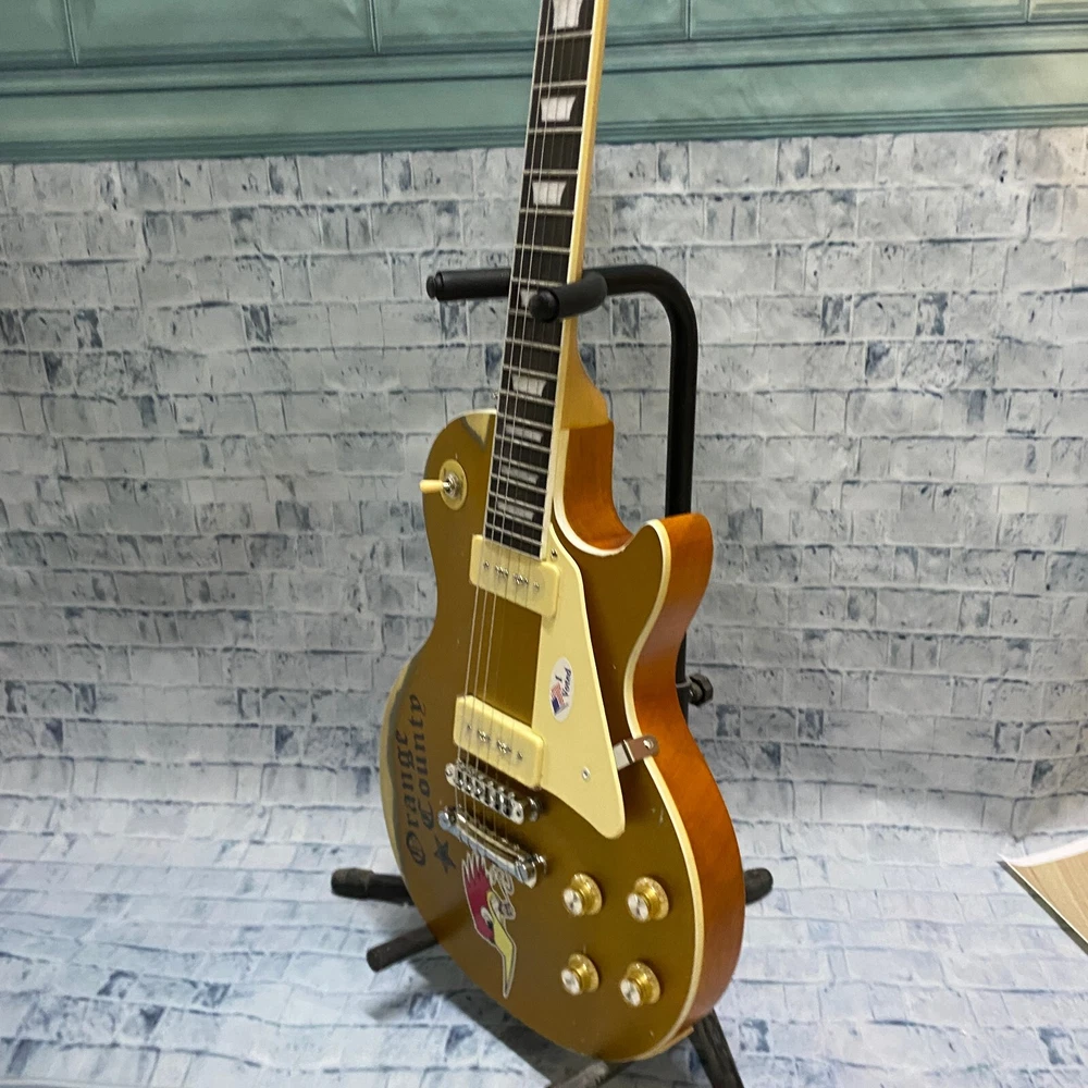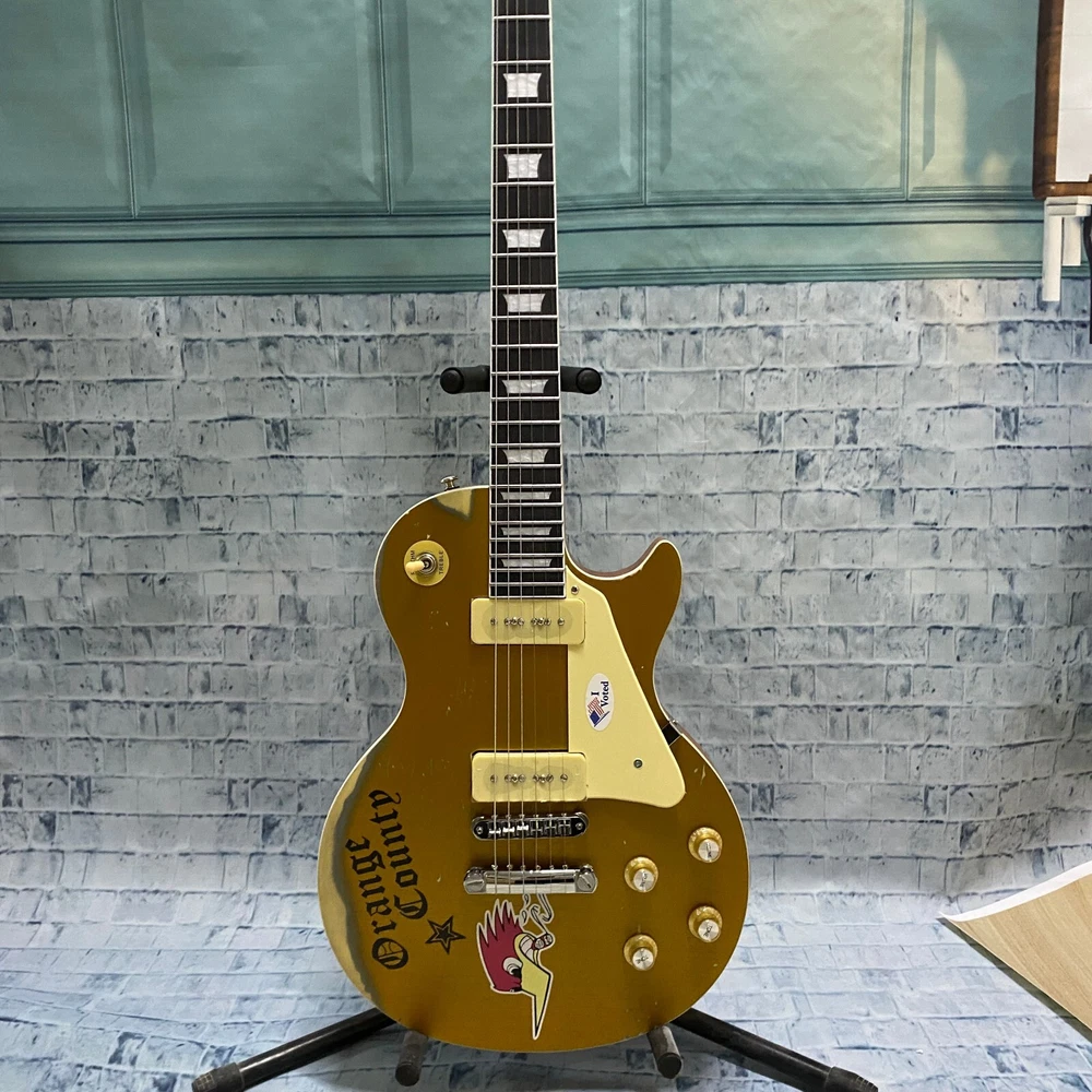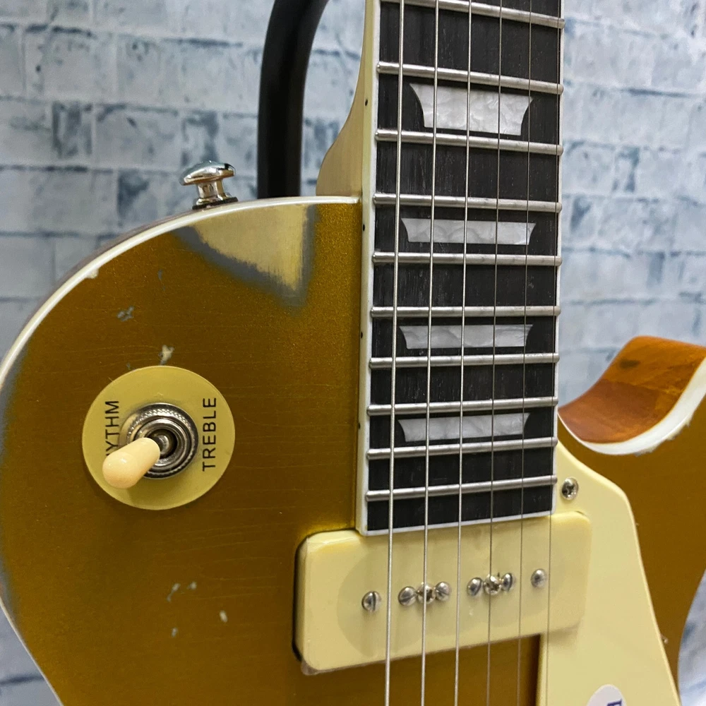 This is a US WAREHOUSE Mike Ness 1976 Deluxe electric guitar in Aged Gold Relics finish. It has a solid Mahogany body and neck, with a Rosewood fretboard and 22 frets. This right-handed guitar features a 6-string configuration and comes with a cable. The model year is 2024 and it is part of the Standard series, suitable for professional level performance. Made in China, this Custom model is a high-quality electric guitar for musicians.