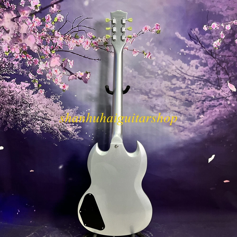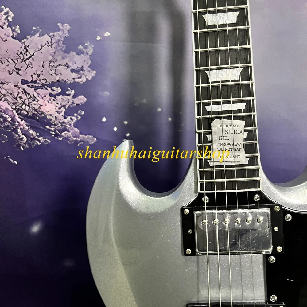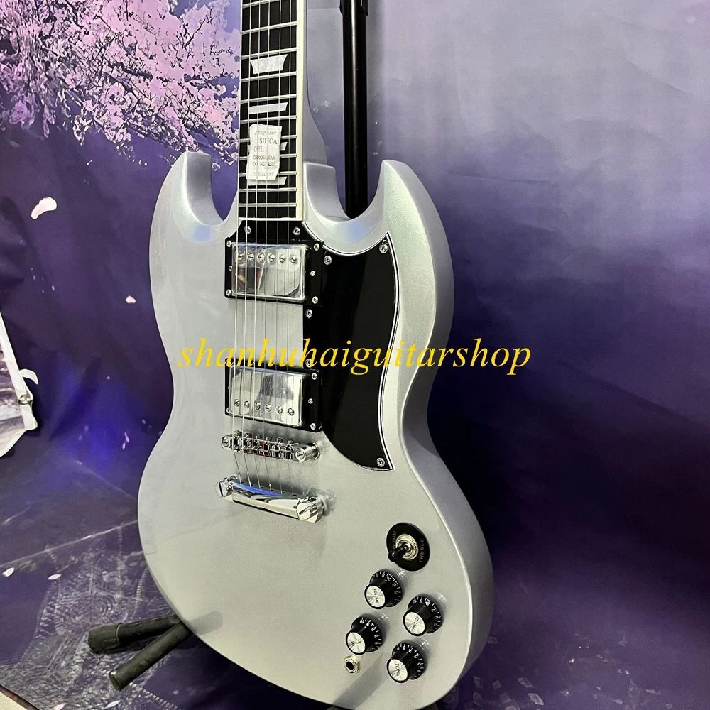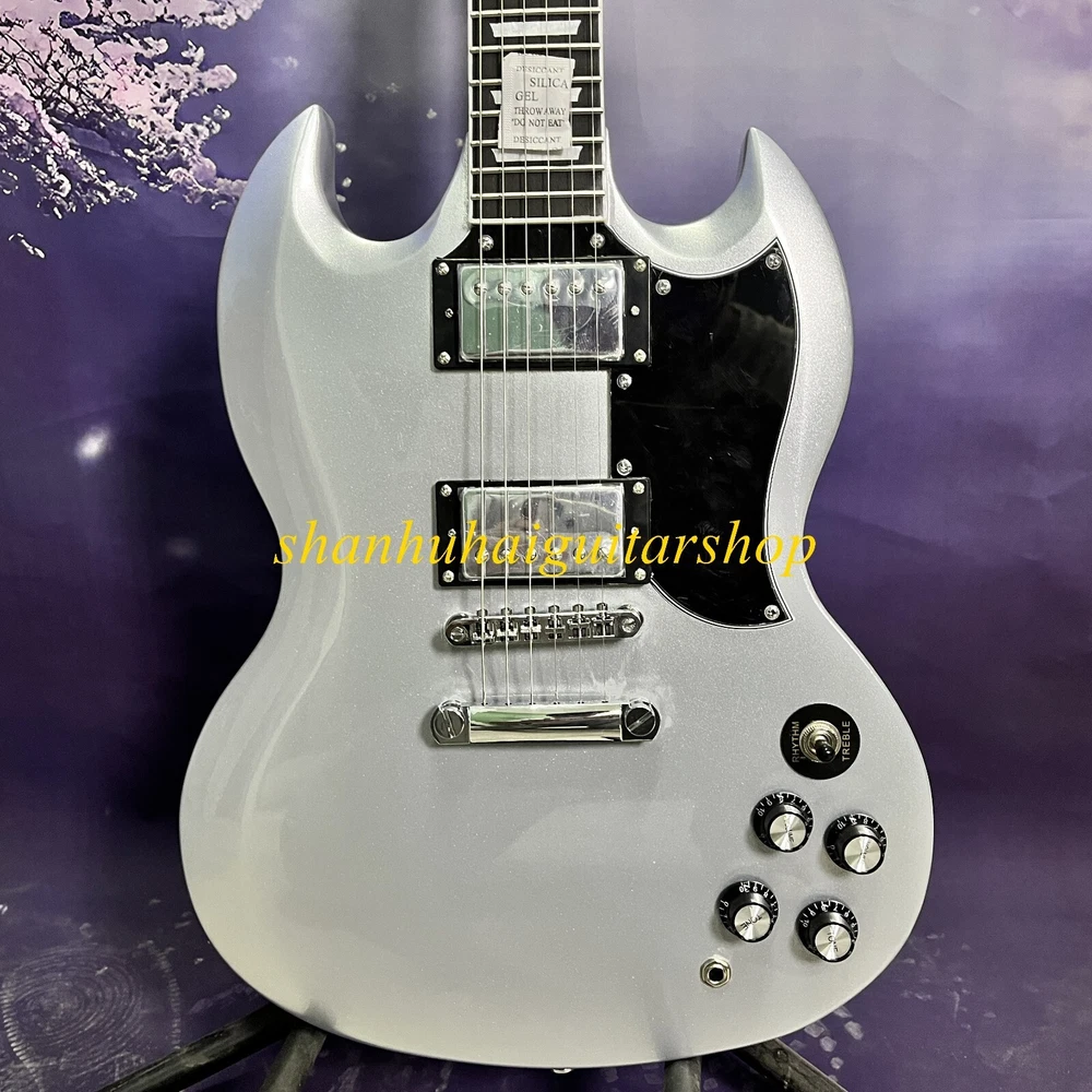 Unleash your musical creativity with the SG electric guitar, a high-quality instrument crafted for the passionate player. The guitar features a sleek silver body, paired with a rich mahogany neck and rosewood fretboard, offering a comfortable grip and smooth playability. Its 22-fret design and six-string configuration allow for a wide range of tones and styles, making it a versatile choice for both beginners and professionals. The WELL-MADE guitar is thoughtfully constructed with a solid body type, ensuring durability and resonance. It comes with a convenient cable, ready to plug in and play. Designed for the right-handed guitarist, this 2024 model blends classic design with modern craftsmanship, reflecting a commitment to excellence that's sure to please any music enthusiast.