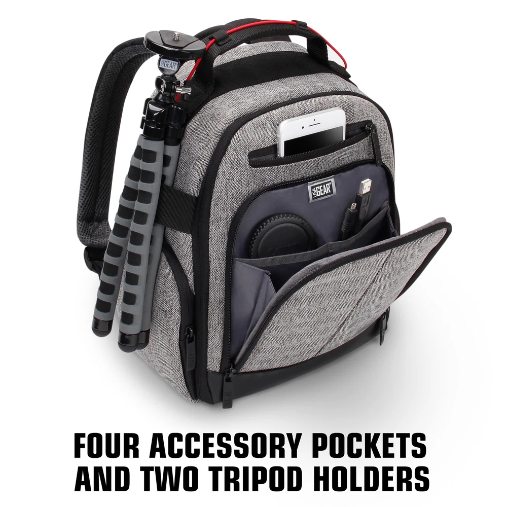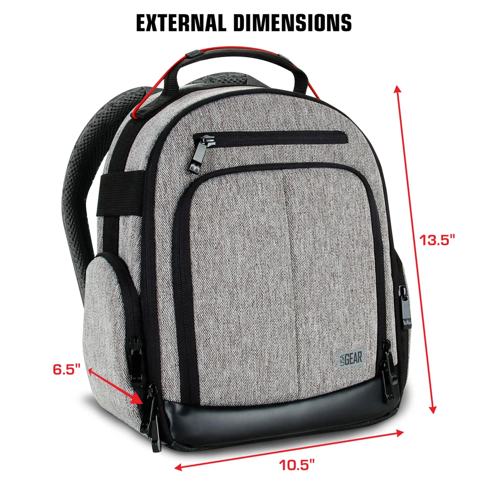 USA Gear UBK Customizable Camera Backpack U Will Always Be in Focus With the USA Gear UBK you're going to be in style no matter what side of the camera you're on. A smooth streamline shape that doesn't sacrifice storage, the UBK is not only practical but is also aesthetically pleasing. A shock web breathable comfort padded back support will help ensure that even your longest days out with your camera equipment will feel light and have you ready for the next location. The USA Gear UBK is Unique, Unparalleled and Unrestricted. Loaded with Features This customizable camera backpack comes with a scratch-resistant interior and customizable storage dividers so you can set up your equipment however you please. Two side straps allow you to attach a tripod or hook on other accessories. A front and two side lens pockets provide plenty of storage room for all your camera equipment. Carry the UBK by its padded handle or use the shoulder straps for even more comfort. All of this, plus a weather-resistant bottom that keeps your bag protected against unfavorable conditions. With a compact form and lightweight design , this bag is ideal for the on-the-go photographer. A camera bag that is the perfect size and has plenty of room for the price. Compatible With: Canon EOS 80D , EOS 5DS , 5DS R , 7D Mark II , 1D X Mark II , 7D , 6D , 70D , Rebel T6s , T6 , T6i , Rebel T5 , T4i , T3i , T3 , T2i , SL1 , PowerShot SX540 HS , SX530 HS , SX510 HS , SX170 IS , SX60 Hs , G3 X , G1 X Mark II / Sony DSC-RX10 III , Alpha SLT-A68 , 7S II , 7R II , 7 II , 7S , A37 , A57 , A58 , A55 , A65 , A77 , A77 II , A99 , DSC-RX10 II , H400 , H300 , H400V , RX10 , A330 , A380 , A390 , A450 , A500 , A550 , A560 , A580 / Nikon Coolpix B700 , 500 , D500 , D3300 , D3400 , D700 , 7200 , P900 , 610 , 600 , 530 , L840 , 830 / Pentax K70 / K50 / K-S2 ...and many other cameras and equipment. Protection Your Way The UBK backpack comes with a scratch resistant interior so you can travel knowing that your camera, lenses, and accessories are safely stored away when they are not in use. Customizable Protection The customizable storage padded dividers allow you to set up your equipment however you please. They can be added/removed/organized based on your needs. Interior Dimensions: 11.5 x 10 x 4.5 inches Compatible with: Nikon D3400 Nikon D3500 Nikon D5300 Nikon D5600 Canon EOS Rebel T6 Canon EOS Rebel T6i Canon EOS Rebel SL2 And many other standard-size DSLRs Style and Function With the USA Gear UBK you're going to be in style no matter what side of the camera you're on. Featuring a smooth streamline shape that doesn't sacrifice storage, the UBK is not only practical but is also aesthetically pleasing. The USA Gear UBK is unique, unparalleled and unrestricted Scratch-Resistant Padded Interior Weather-Resistant Bottom Rugged Metal Zippers Soft Rubber Pullers Compact Design Featuring enough storage space for a full-size DSLR w/lenses & other accessories while maintaining an ultra-compact form factor. Dual interior zippered accessory pockets Multiple exterior zippered accessory pockets Fortified Handle Padded Straps Wear as a Backpack or Sling Rugged & Stylish Design Built for storage and travel, but designed with a professional and subtle aesthetic, the USA Gear UBK Camera Backpack's soft interior protects your camera and accessories from abrasive damage, while the rugged exterior protects against the elements. Customizable Interior Utilize the removable dividers to create custom storage pockets and compartments for your unique storage desires. Create pockets for your camera, spare batteries, cables, and much more. Also comes with a hook and loop elastic strap to hold down your drone or controller. Water Resistant Base The base of the backpack features a water resistant material to keep moisture from seeping up into your backpack when placed on damp floor or dewy grass. Feel comfortable knowing your backpack will protect your camera from the elements. Comfortable Construction Padded shoulder straps reduce fatigue when wearing over long periods of time, while the breathable moisture wicking backing keeps your back cool and fresh even during a warm day. USA Gear's compact camera backpack is comfortable, practical, and portable.