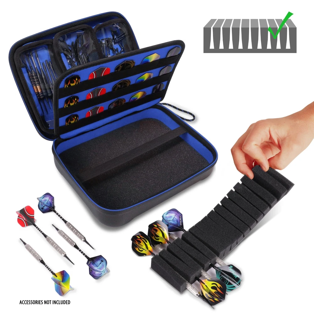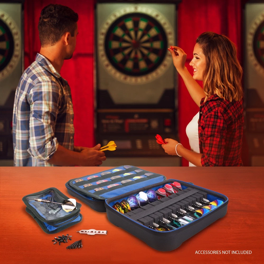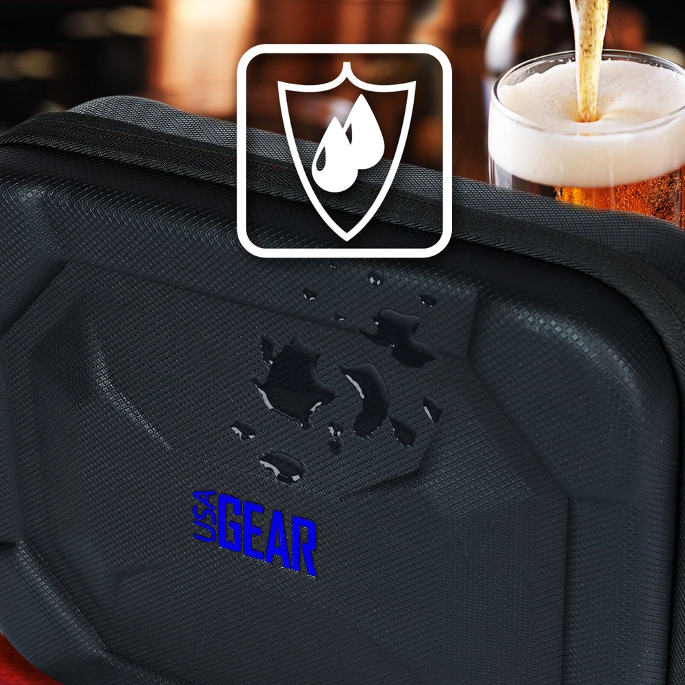 USA GEAR XL Hard Shell Dart Case Ultra Durable The USA GEAR durable hard dart case is constructed from molded EVA semi-hard shell and designed to securely store, protect, and transport steel darts, soft tipped darts, and more dart accessories. The case is ideal for all player types, from someone that is just getting started to the more advanced player. Hold fifteen professional darts with case and always have it ready to take to the dart board. The dart accessory case can be used as a dart case for steel darts or as dart cases for soft tip darts. Snug & Secure Fit With an innovative dart lock design, the case ensures your fifteen darts will stay in place and will shield your flights from bending. The accessory middle flap provides 15 slots for your dart flights, while the three clear accessory pouches hold your dart tips and shafts. Use the included strap to secure the dart pocket case around your wrist, fasten to your backpack, or loop through your belt! Quality Design Featuring heavy-duty materials and high-grade construction, USA GEAR cases are built to last! Have confidence in all USA GEAR products, Compatible With: Steel tip darts and Soft tip darts Interior Dimensions: 9.4 x 7.2 x 1.2 inches Weight: 1 lb **CASE ONLY** XL Hard Shell Dart Case USA GEAR’s durable XL Hard Shell Dart Case is designed to securely store, protect, and transport your steel and soft tipped darts. Our innovative dart lock design ensures a secure fit for your darts and prevents movement inside the case. The larger size holds 15 assembled darts and ensures the flights won’t get bent or crushed. Use the included strap to secure around your wrist for easy transportation. Lightweight Hard Shell Design Holds 15 Assembled Darts 15 Elastic Accessory Slots 3 Clear, Puncture Resistant Zippered Pockets Interior Dimensions: 9.37 x 7.16 x 1.2 inches Protective Shell The outer shell protects the contents from drops and impacts and is wrapped in a textured material that is easy to grip. The rubberized material over hard shell EVA is resistant to moisture, giving your darts and accessories protection from water, drinks, and other liquid hazards. Water Resistant Impact Resistant Scratch Resistant Lanyard Included Perfect for All Player Types The case is ideal for all player types, from someone that is just getting started to the more advanced player. The Dart Case offers secure protection for steel and soft tipped darts. With plenty of room for assembled darts, extra flights, tips, and barrels store everything you need in this case! The outer shell protects the contents from drops and impacts and is wrapped in a textured material that is easy to grip. Store Steel & Soft Tipped Darts Innovative Dart Lock Design Secure Dart Lock Design With an innovative dart lock design, the case ensures your darts will stay in place and shield your flights from bending. The foam holder’s slots are tapered at the bottom to secure the dart and eliminate the dart from sliding up and out of the holder. Water Resistant Exterior The water resistant exterior protects against moisture from water, drinks, and other liquid hazards. Have peace of mind when using our XL Dart Case, knowing your gear is in a safe place. Spacious Interior The XL Dart Case offers secure protection for steel tipped darts and soft tipped darts. With room for 15 dart flights, 15 assembled darts, and extra space for tips and barrels, there is plenty of space for all of your dart essentials. Travel Ready Design Made from an EVA hard shell body with a rubberized exterior, our XL Dart Case provides resistance from scratches, impacts, and bumps. Use the attachable wrist strap for easy carrying.