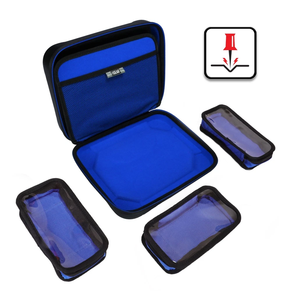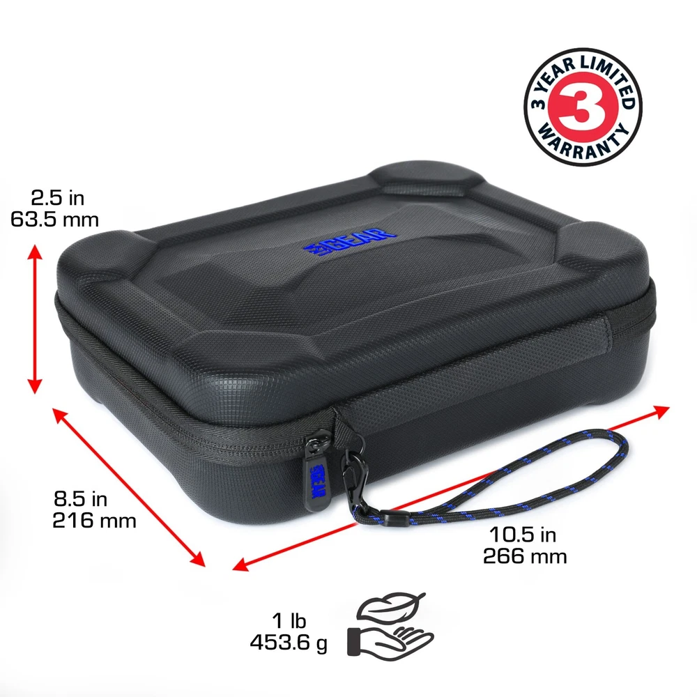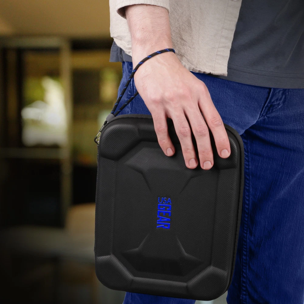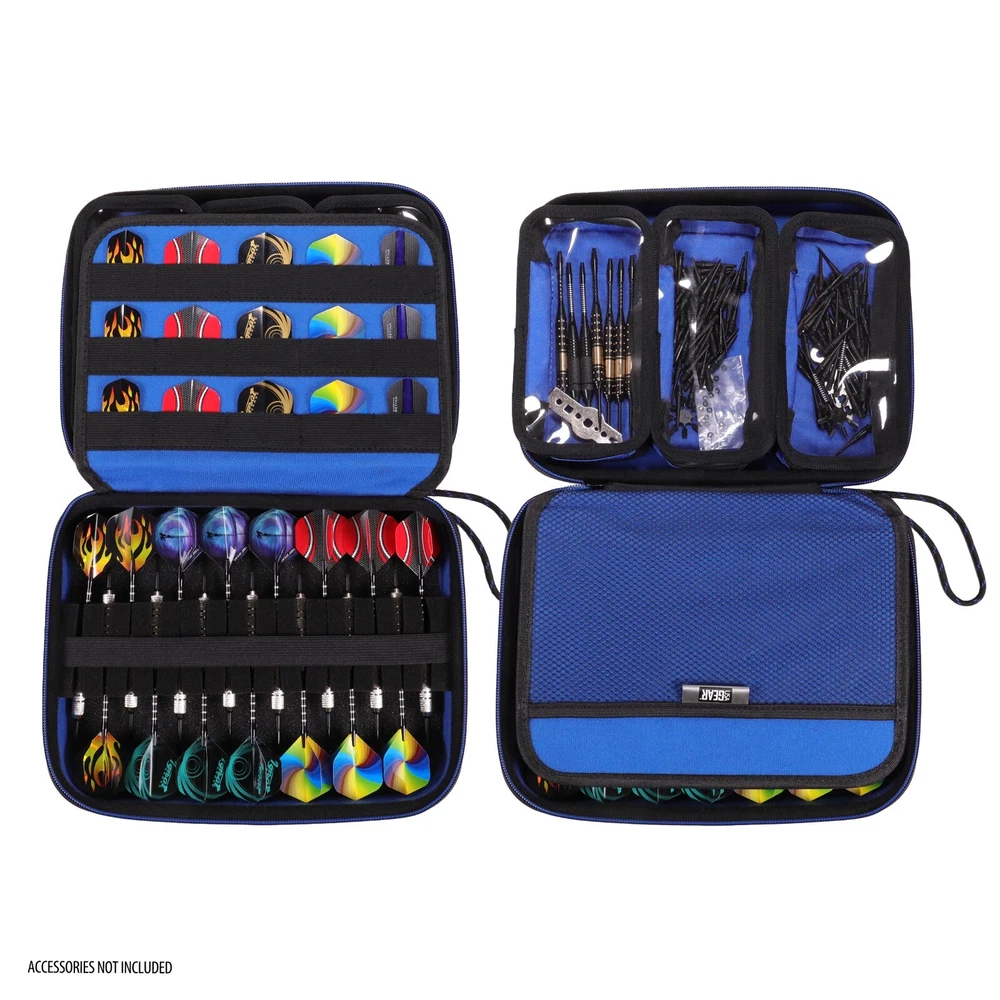 USA GEAR XL Hard Shell Dart Case Ultra Durable The USA GEAR durable hard dart case is constructed from molded EVA semi-hard shell and designed to securely store, protect, and transport steel darts, soft tipped darts, and more dart accessories. The case is ideal for all player types, from someone that is just getting started to the more advanced player. Hold fifteen professional darts with case and always have it ready to take to the dart board. The dart accessory case can be used as a dart case for steel darts or as dart cases for soft tip darts. Snug & Secure Fit With an innovative dart lock design, the case ensures your fifteen darts will stay in place and will shield your flights from bending. The accessory middle flap provides 15 slots for your dart flights, while the three clear accessory pouches hold your dart tips and shafts. Use the included strap to secure the dart pocket case around your wrist, fasten to your backpack, or loop through your belt! Quality Design Featuring heavy-duty materials and high-grade construction, USA GEAR cases are built to last! Have confidence in all USA GEAR products, Compatible With: Steel tip darts and Soft tip darts Interior Dimensions: 9.4 x 7.2 x 1.2 inches Weight: 1 lb **CASE ONLY** XL Hard Shell Dart Case USA GEAR’s durable XL Hard Shell Dart Case is designed to securely store, protect, and transport your steel and soft tipped darts. Our innovative dart lock design ensures a secure fit for your darts and prevents movement inside the case. The larger size holds 15 assembled darts and ensures the flights won’t get bent or crushed. Use the included strap to secure around your wrist for easy transportation. Lightweight Hard Shell Design Holds 15 Assembled Darts 15 Elastic Accessory Slots 3 Clear, Puncture Resistant Zippered Pockets Interior Dimensions: 9.37 x 7.16 x 1.2 inches Protective Shell The outer shell protects the contents from drops and impacts and is wrapped in a textured material that is easy to grip. The rubberized material over hard shell EVA is resistant to moisture, giving your darts and accessories protection from water, drinks, and other liquid hazards. Water Resistant Impact Resistant Scratch Resistant Lanyard Included Perfect for All Player Types The case is ideal for all player types, from someone that is just getting started to the more advanced player. The Dart Case offers secure protection for steel and soft tipped darts. With plenty of room for assembled darts, extra flights, tips, and barrels store everything you need in this case! The outer shell protects the contents from drops and impacts and is wrapped in a textured material that is easy to grip. Store Steel & Soft Tipped Darts Innovative Dart Lock Design Secure Dart Lock Design With an innovative dart lock design, the case ensures your darts will stay in place and shield your flights from bending. The foam holder’s slots are tapered at the bottom to secure the dart and eliminate the dart from sliding up and out of the holder. Water Resistant Exterior The water resistant exterior protects against moisture from water, drinks, and other liquid hazards. Have peace of mind when using our XL Dart Case, knowing your gear is in a safe place. Spacious Interior The XL Dart Case offers secure protection for steel tipped darts and soft tipped darts. With room for 15 dart flights, 15 assembled darts, and extra space for tips and barrels, there is plenty of space for all of your dart essentials. Travel Ready Design Made from an EVA hard shell body with a rubberized exterior, our XL Dart Case provides resistance from scratches, impacts, and bumps. Use the attachable wrist strap for easy carrying.