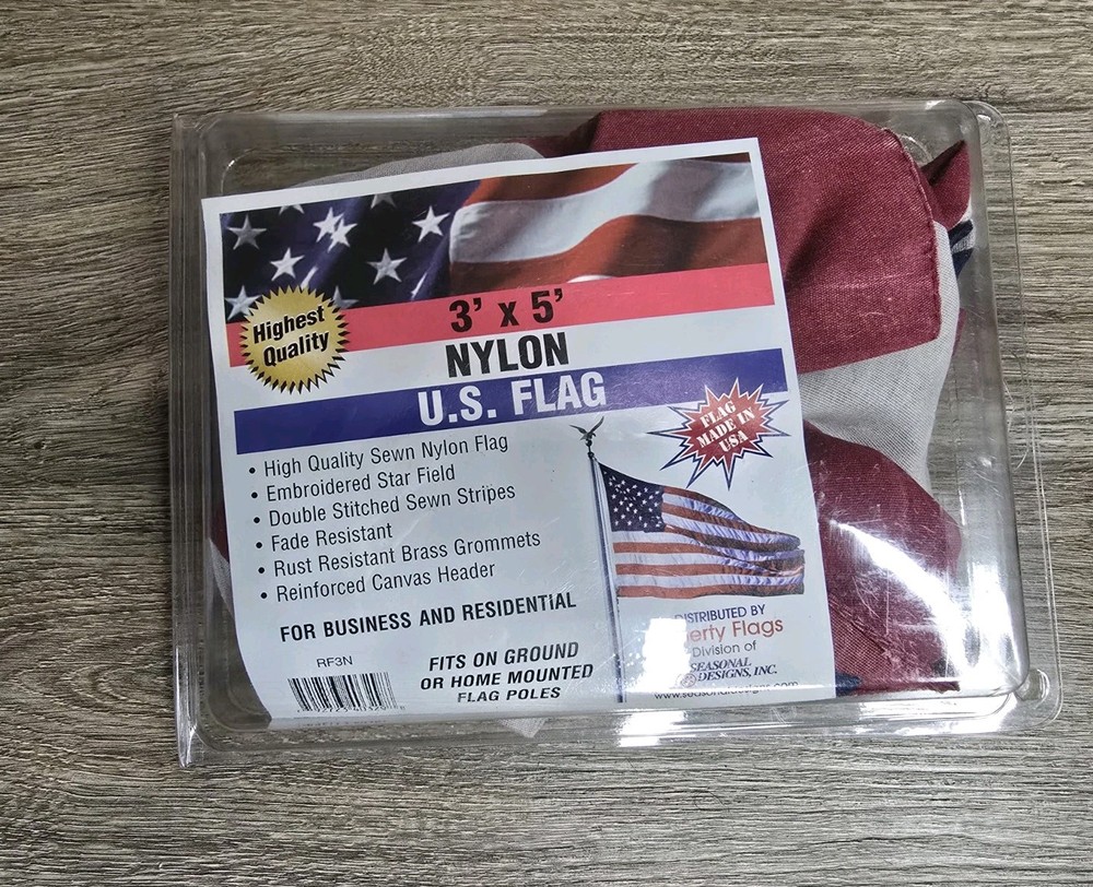 Show your patriotism with this American flag from Seasonal Designs. Made from durable nylon, this 3 ft. x 5 ft. flag features vibrant red, white, and blue colors and brass grommets for easy mounting. Its patriotic theme makes it the perfect decoration for any patriotic event or occasion. This United States flag is designed with a national flag subject and is made in the United States. Its unit type is in feet, and it is the perfect size for outdoor use. Get this flag today to show your love for the United States.