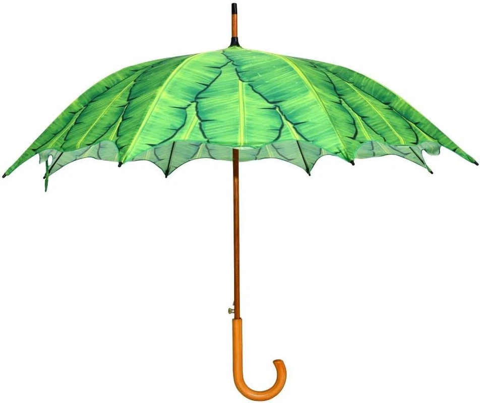 Bright and colorful umbrella makes a walk in the rain more fun Displays overlapped banana leaves when open Schima superba wood handle and ferrule complete the look of this eye-catching umbrella Fiberglass shaft with high-quality spring; sturdily constructed to provide years of service 40.9” wide x 34.6” high Esschert Design TP336 Banana Leaf Umbrella, Green. This bright and colorful umbrella displays overlapped banana leaves when open. The Schima superba wood handle and ferrule complete the look of this eye-catching umbrella. Features a fiberglass shaft with high-quality spring; sturdily constructed to provide years of service. Dimensions: 40.9” wide x 34.6” high. Weighs 1 pounds. Esschert "More Than A Design"