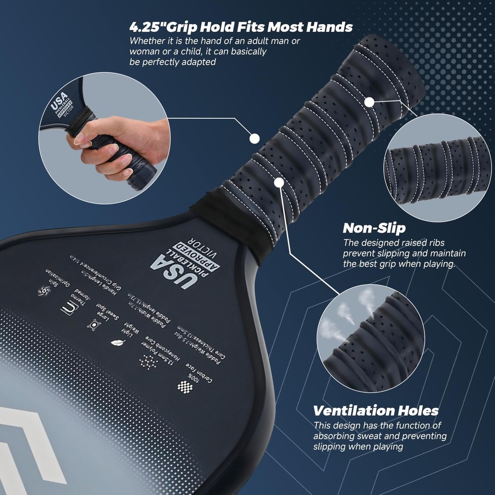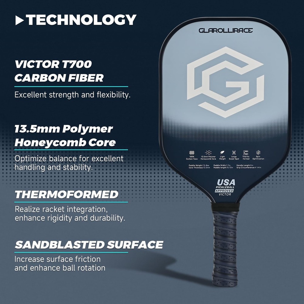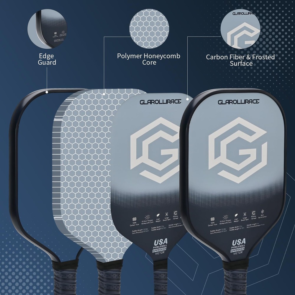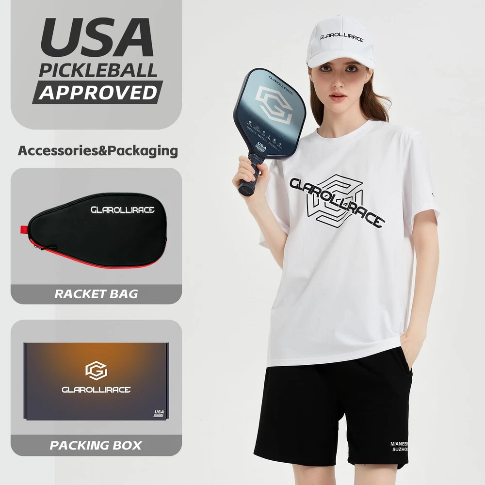 Glarollirace pickleball paddles are certified by the USAPA, safe and professional, and meet tournament standards. They are suitable for both beginners and professionals. The surface of the paddle is made of carbon fiber material, providing good elasticity, reducing ball deflection, and giving the pickleball paddle the best ball-striking feel. The core is a 13.5mm polymer honeycomb structure, reducing vibration, being lightweight and durable, and achieving a perfect balance between excellent power and control. The surface of the pickleball paddle is frosted, increasing the friction between the paddle and the ball, optimizing the rotation of the ball, and greatly improving the feeling of hitting the ball. The handle of the paddle is made of soft material, extremely comfortable to hold, and is designed with ventilation holes and stitching for sweat absorption and anti-slip. It is extremely wear-resistant and durable, providing better rotation and movement for your wrist, and you will not feel tired even after playing for a long time. The paddle is made by hot pressing molding, which makes it have accurate dimensions and high strength and rigidity. The surface of the paddle is 10.73 inches long and 7.7 inches wide, providing a large sweet spot for better control in every hit. The paddle weighs only 7.5-8.0 ounces, has better maneuverability, and achieves a perfect balance between power and control. 【Premium Quality Materials】Glarollirace pickleball paddles are carbon fiber on the surface with 13.5mm polymer honeycomb core.The carbon fiber on the surface provides good elasticity, reduces ball deflection, and gives the pickleball paddles the best ball-striking feel. The polymer honeycomb core reduces vibration, is lightweight and durable, and achieves a perfect balance between excellent power and control. 【USAPA Approved】Glarollirace pickleball paddles are USAPA certified to be safe and professional and meet tournament standards.Whether you are a beginner or a professional, choosing Glarollirace pickleball paddles, it is believed that you can have a perfect performance on the court. 【Frosted Surface】The surface of the pickleball paddle is frosted, which increases the friction between the paddle and the ball, optimizes the rotation of the ball, greatly improves the feeling of hitting the ball, and takes your game to a new level. 【Ultra Comfortable Grip】Glarollirace pickleball paddle grip is made of soft material, which is extremely comfortable to hold. It is designed with ventilation holes and stitching for sweat absorption and anti-slip. It is extremely wear-resistant and durable, providing better rotation and movement for your wrist. You will not feel tired even after playing for a long time. 【Light & Large Sweet Spot】Glarollirace pickleball paddle is made by thermoforming, which makes it have accurate dimensions and high strength and rigidity. The surface of the racket is 10.73 inches long and 7.7 inches wide, providing a large sweet spot for better control in every hit. The racket weighs only 7.5-8.0 oz, has better maneuverability, and achieves a perfect balance between power and control.