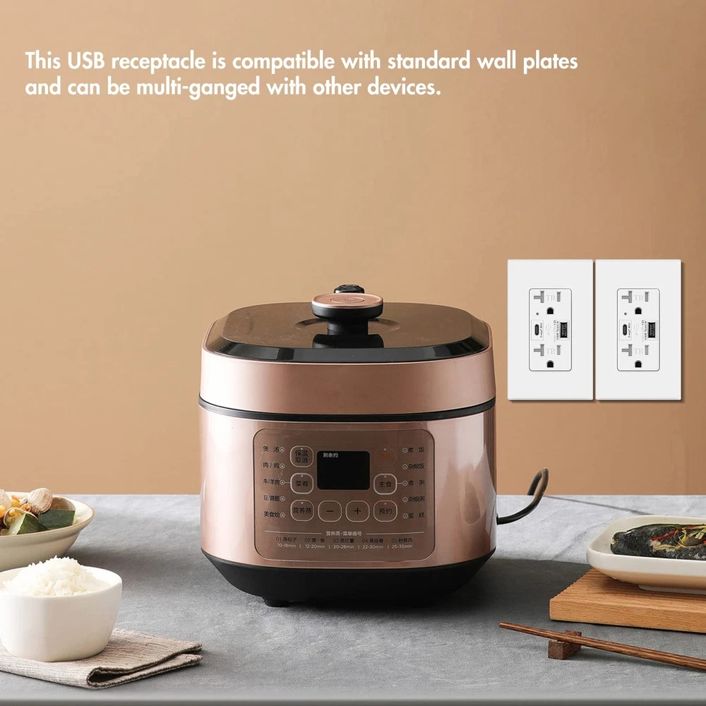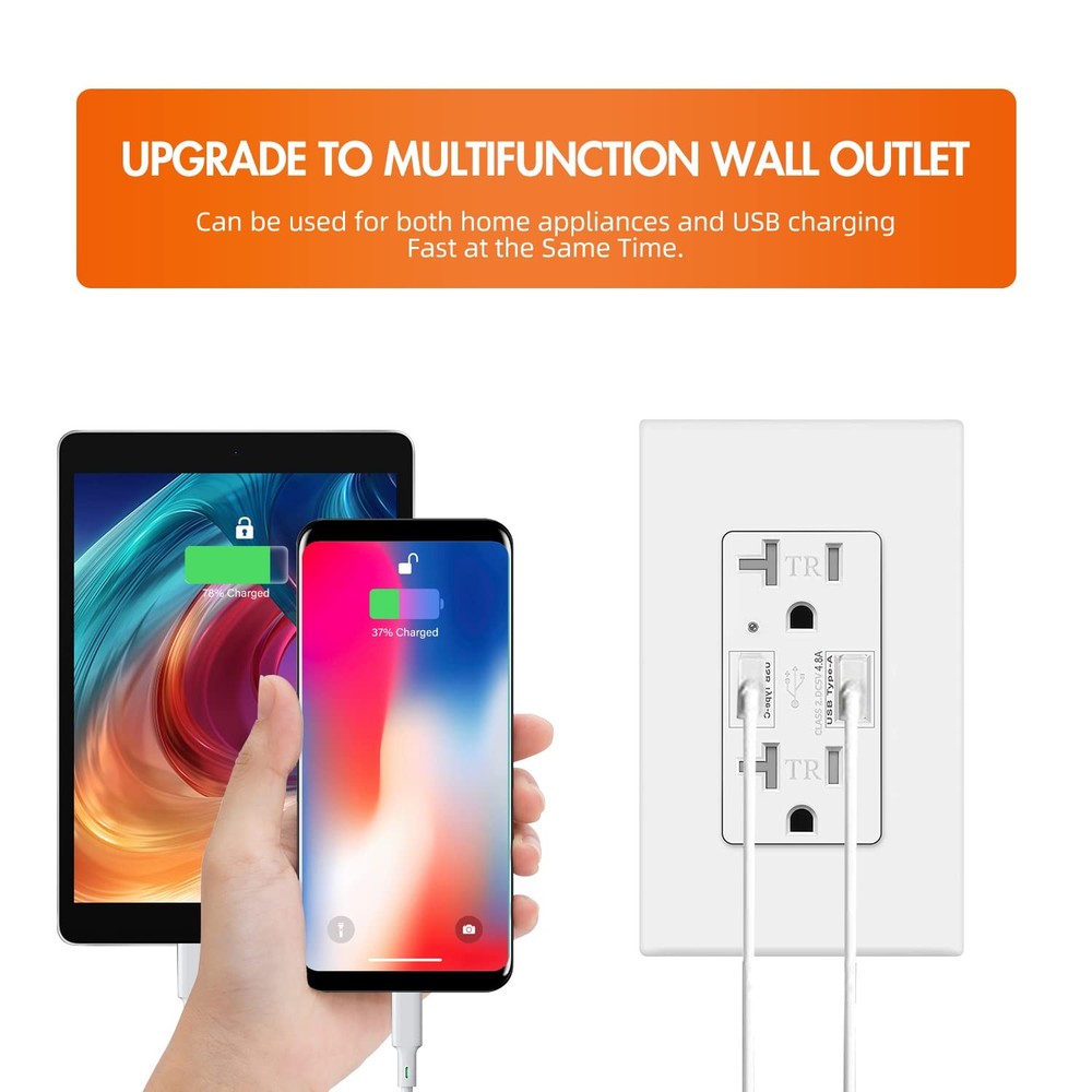 This USB C Outlet is a must-have for any modern household or office. It features a 4.8A Type C + A Fast Charger, Tamper Resistant 20-Amp Receptacle, and is UL Listed, making it safe and reliable to use. With its versatile design, it can charge up to four devices simultaneously, and its fast charging capabilities ensure that your devices are powered up quickly and efficiently. The 20-Amp Receptacle also provides ample power for larger devices such as laptops, tablets, and gaming consoles. The USB C Outlet is compatible with a wide range of devices, including iPhone, Samsung, Google, and more, so you can use it with all of your favorite gadgets. Whether you're at home, at work, or on the go, this USB C Outlet is the perfect solution for all of your charging needs. Dual Fast Charging Ports: Enjoy the convenience of simultaneous fast charging with both Type C and Type A ports, providing a total output of 4.8A. Whether you're using an iPhone, Samsung, Google device, or other compatible gadgets, this outlet delivers a rapid and efficient power boost. Tamper-Resistant Design: Safety is our top priority. The tamper-resistant receptacle prevents foreign objects from being inserted, offering an extra layer of protection for your family and devices. Universal Compatibility: This outlet is engineered to accommodate a wide range of devices, including iPhones, Samsung phones, Google devices, and more. Say goodbye to compatibility issues and enjoy a seamless charging experience. UL Listed for Peace of Mind: Rest easy knowing that our USB C Outlet is UL Listed, meeting rigorous safety and performance standards. Your safety is our priority, and this certification ensures that our product has been thoroughly tested for quality and reliability. Easy Installation: Upgrade your outlets effortlessly. Our USB C Outlet is designed for easy installation, making it a perfect addition to any room in your home or office. Note: This is not a USB-C Power Delivery (USB PD) charger. It is not compatible with devices that require USB PD for fast charging, including certain newer smartphones and smartwatches.