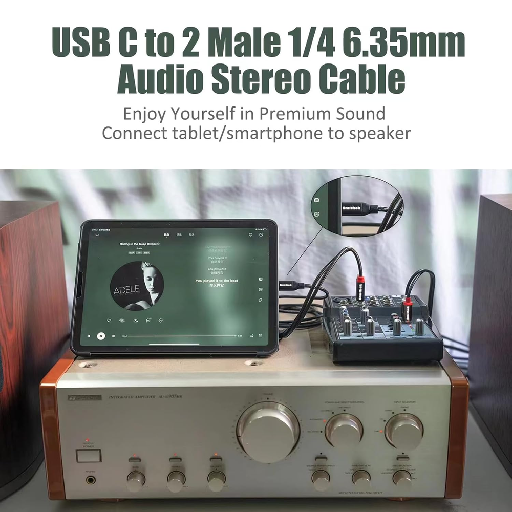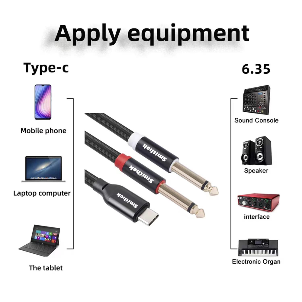 Store New Arrivals Add to Favorite View Feedback Contact USB C to Dual 6.35Mm 1/4 Inch Stereo Splitter Cable for Smartphone Tablet Laptop Description Item model number -USB C 01 Cable Type USB Connector Type USB Type C Compatible Devices Amplifier,Mixers,iphone 15,iphone 15 plus,iphone 15 pro,iphone 15 pro max,ipad pro Special Feature Heavy duty,Gold plated,Braided,Hi Fi sound Package Dimensions 7.76 x 4.57 x 0.47 inches; 0.63 ounces Size 3.3ft(1m) USB-C to Dual 1/4 inch TS Splitter Y Cable: USB-C to 1/4" Stereo Splitter Y Cable help us split the stereo signal into left and right channel output, connects a smartphone, tablet, or laptops with USB-C port output interface of the audio signal to a speaker, stereo receiver, or other device with 1/4" left and right channels, use it for outputting excellent audio signal. * IMPORTANT NOTE: Recording Is Not Supported, Only For Output Audio Excellent Audio Cable Design: USB-C to Dual 1/4 inch (6.35mm) TS Splitter Y Cable uses Dual-shielding, no noise/hum or hiss. Gold-Plated connectors , more sensitive and more steady connection. Oxygen-Free All Copper conductor, minimizes signal loss during transmission. DAC Chip for Superior Sound Quality: USB-C to Dual 1/4 inch (6.35mm) TS Splitter Y Cable built-in with a high-quality DAC Chip that allows up to 44.1khz-16bit Hi-Fi sound quality, wide, natural soundstage and uncolored sound, bring perfect sound enjoyment to your ears. Beautiful & Sturdy Durable: USB-C to Dual 1/4 inch (6.35mm) TS Splitter Y Cable uses Aluminum-Alloy Shell, Corrosion Resistant and Soilid, not easy to damage. PVC exterior offers added strength and flexibility, ensure 15000+ bending. Standard plug, sturdy connectivity. Unusual Audio Cord & High Quality Service: You will get 1 Pack 3Feet USB-C to Dual 1/4 inch (6.35mm) TS Splitter Y Cable(length: 6 Foot) with Lifetime of warranty( Free replacement or Money-back) and lifetime friendly customer services. Buy it to help you enjoy music. Product description Smithok USB C to Dual 6.35mm 1/4" TS Mono Stereo Y Splitter Cord is designed for connecting a channel insert on an audio mixing control board to audio processor with 1/4" unbalanced signal. Connecting TS plug into the USB C devices. Connecting your portable audio devices (Smartphone, Tablets, USB C Laptap) to loudspeaker system, sound cards, PA audio, Mixer, Amplifier,Pre-amp, Home theater devices and more. Installation · Free drive,not install any software. · Please ensure compatibility and correct operation of all connected equipment before the cable is installed. · Please hold the connectors by hand to plug and unplug, avoid drawing the wire itself directly. Package Contents USB C to Dual 6.35mm 1/4" TS Mono Stereo Y Splitter Cord ×1 Smithok USB-C to 1/4 inch TS Y Splitter Cable Notes: Due to audio chip built-in, there is compatibility problems with partial brands of smartphone&laptops. But we can be sure that most smartphones and USB C computers works perfectly. We're very sorry if this has caused you unnecessary trouble. The audio signal is only from USB C to 1/4 plugs, Not working if from 1/4 end to USB C end. USB C to Dual1/4" TS Mono Stereo Y Splitter Cable Product Features: · Two Y split length: 12 inches Updated · The surface treatment of connectors: 24K gold-plated · Shielding layer: Aluminum Foil Shieldings · The material of shell: Anodizing Alloy Case · This cable jacket: Nylon Braid · Connector A: USB C(Type C) Male · Connector B: Dual 1/4 TS Plugs Male · Cable Conductors: Copper 24K Gold-plated · 1/4 stereo cable with 24K Gold-plated for better sound quality output and minimal signal loss and has a more better anti-oxidation capacity Amazing Sound Output · The TS mono to stereo audio cable with OFC conductor and shielding layers, this audio cable could provide maximum conductivity and durability, and ensure perfect and clear sound quality output. Braided Jacket · This audio cable is equipped with cotton braided against scratching & abrasion, prolonging its service life. It's has strong toughness and tensile. Stable Audio Signal Transmission · Smithok Type C to 1/4 cable is made of ofc copper conductors for enhancing signal clarity and it's a best choice for music studio or living performances; · Smithok USB-C to 1/4 inch TS Y Splitter Cable constructured with multiple shielding layers provides maximum's conductivity and durability, and ensure amazing sound quality output. ABOUT US We offer the best prices around on high quality products. Our E-store includes media such as books, movies, music and games while offering electronics, toys, sporting apparel, clothing, tools, general home, garden items and more. SHIPPING We are always working hard to ensure your package arrives as soon as possible. Please understand that some factors like weather, high postal traffic, and the performance of shipping companies are outside of our control. We offer free shipping to the lower 48 states and ship within 2 business days of payment, usually sooner. We do not accept P.O. Boxes. Please provide a physical address. For shipping outside of the continental USA, we only use eBay's Global Shipping Program.The item is shipped to KY and then sent to the rest of the world. International customers are responsible for all duties and taxes. Continue to check out in order to calculate costs for shipping the item to your country. Messages regarding eBay's Global Shipping Program MUST be directed at eBay EXCLUSIVELY. RETURNS We offer a 30-Day Return Policy on items which you are not completely satisfied with. You have the option for a full-refund or an exchange of the item. No returns are available on items shipped outside of the USA. PAYMENT We accept PayPal. CONTACT US This page content is yet to come Please ad us to your favorite seller and visit again later Thank You CUSTOMER SATISFACTION We try our very best to make sure every customer is completely satisfied. If there's a problem, message us! We're happy to help. WE ACCEPT Cop