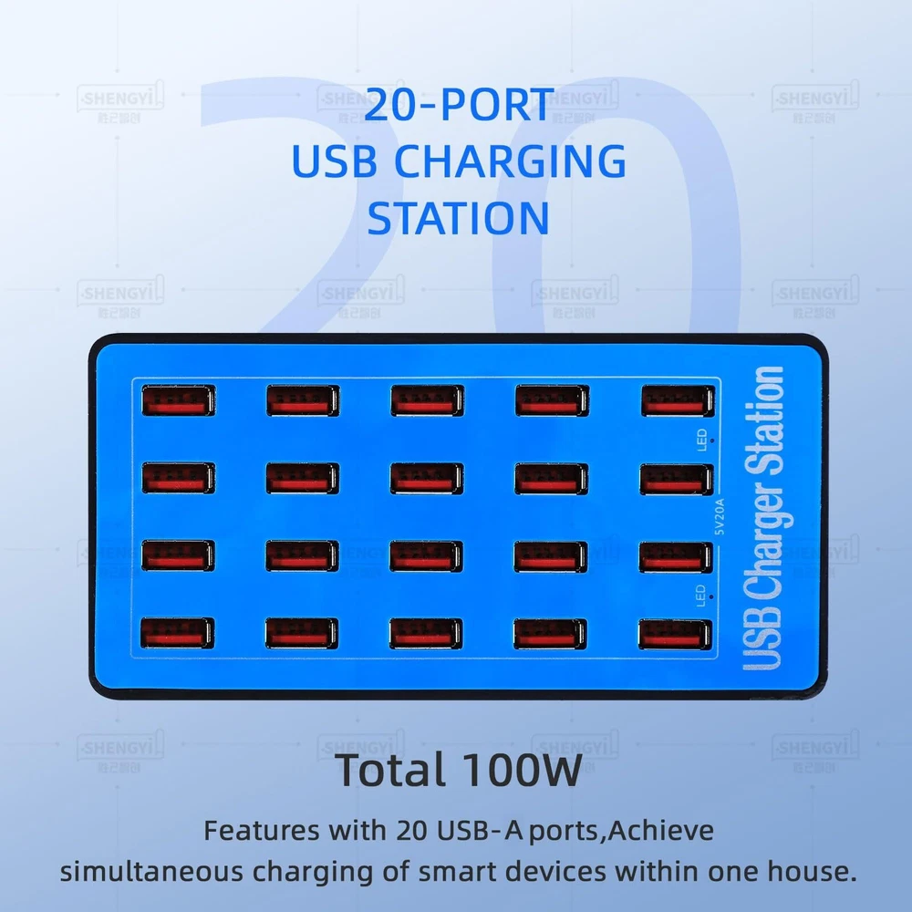 Charge 20 Devices Simultaneously: This multiple USB charger station supports up to 20 devices at once. with iPhone, Samsung Galaxy, , Headphones, and more. Each port delivers up to 2.4A for efficient charging. Powerful Charging: With a total output of 100W/20A, this multi USB charging station ensures fast charging. Perfect for international travel with 100-240V wide voltage support and up to 2.4A per port. High-Quality and Safe: Made with fireproof PC materials, this multiple USB charger station includes protections against overcharge, overload, overcurrent, and overheating, thanks to its intelligent chip and efficient heat dissipation. Compact and Space-Saving: This multi USB charging station is compact, making it easy to carry. Ideal for home, office, school, and travel, providing a tidy charging solution. Universal Compatibility: with smartphones, , e-readers, and more. The multiple USB charger station ensures a risk-free purchase and complete satisfaction. Friendly Reminder: This product is not suitable for short circuit testing or high current testing and is specifically designed for mobile, pad, watch, and other low voltage electronic devices, The maximum output per port should not exceed 6 amps. Please use standard charging cables whenever possible. If you have any questions about the USB charging station, please us.