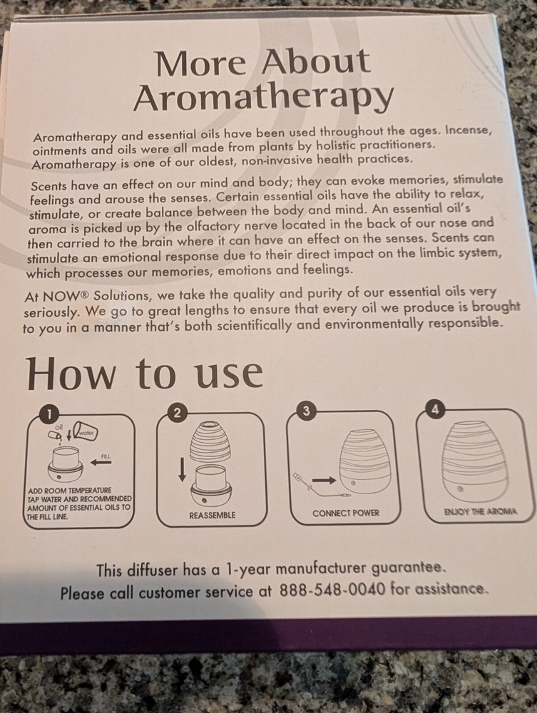 Color: White Intended Use: Aromatherapy Brand: Now Solutions Number in Pack: 1 Installation Area: Device Type: Oil Diffuser Country of Origin: China Features: Diffuser Labels & Certifications: 100% Concentrated Form: Oil Handmade: No Department: Adults Style: Modern Scent: Assorted/Mixed Material: Plastic