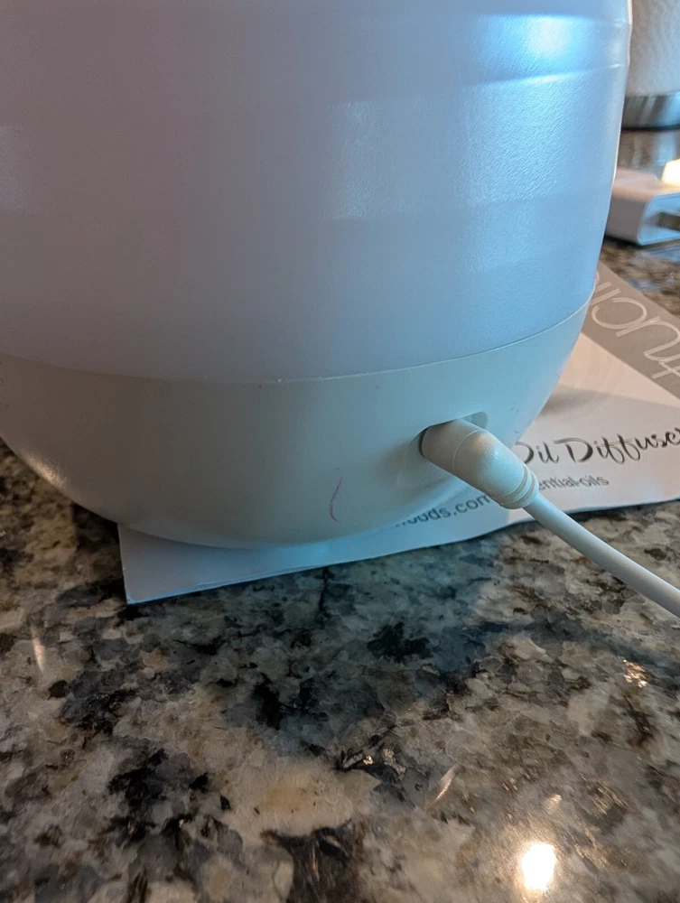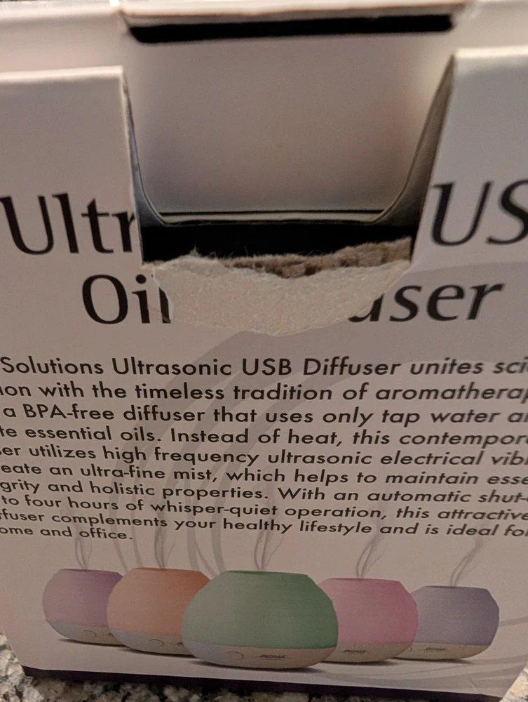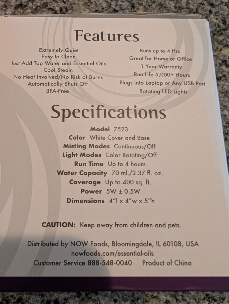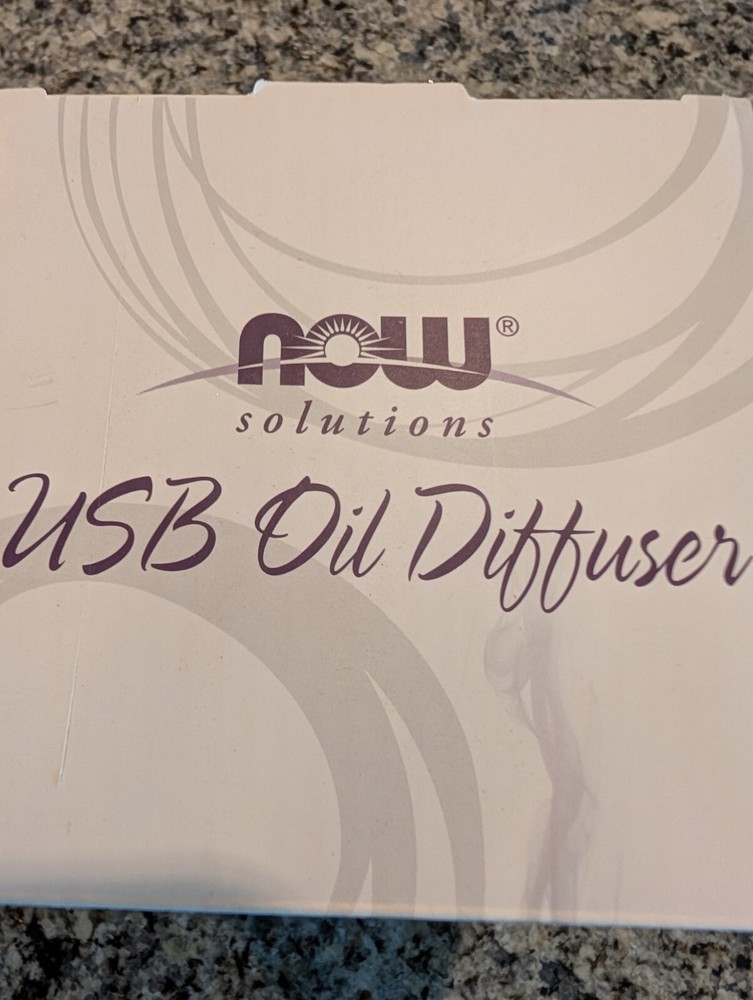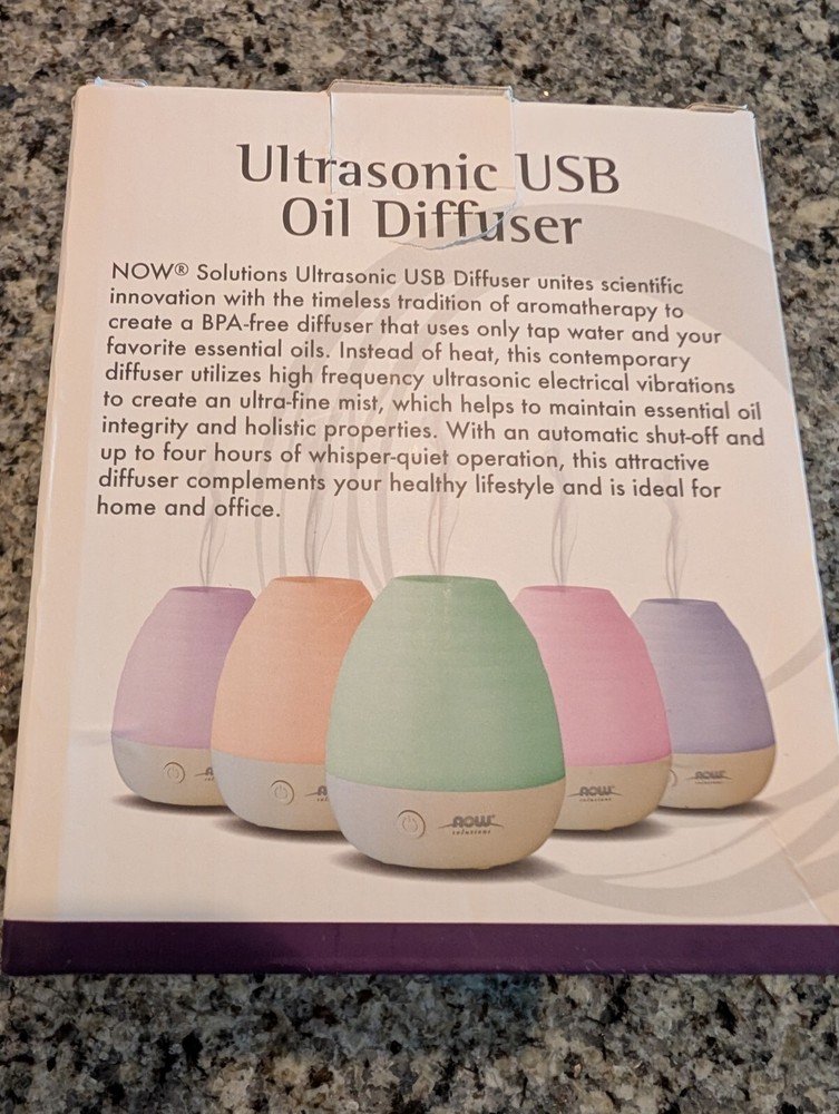 USB Oil Diffuser BPA Free Now Solutions Extremely quiet Easy to Clean Just add tap water and essential oils Cool steam, no heat involved BPA Free. Runs up to 4 hours Plugs in to Laptop or any UBS Port Gently used. Original box and instructions (see picture of box flap which is missing) included Rotating LED lights This device has been tested and is operational Essential Oils Not Included