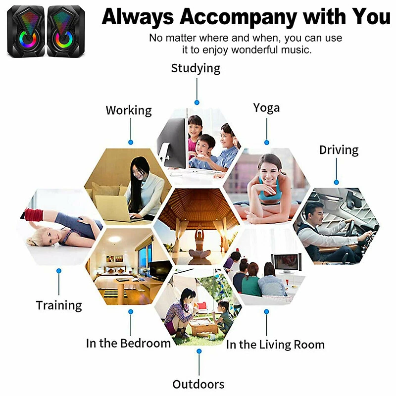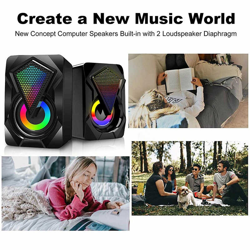 Product Description If you have any questions, please contact customer service first, do not open disputes easily, thank you! Feature: High-Quality Sound: The RGB computer speakers built-in 2*3W balanced stereo speakers, can deliver powerful stereo sound and outstanding bass quality. Excellent sound performance that gives you a pleasant experience when playing games, watching movies, or listening to music. Colorful LED Lights: The RGB desktop speakers alternately emit 7 colors of lights, which is attractive in the dark. Enhance the atmosphere of music, watching movies, and playing games. Plug and Play: USB powered and no drivers needed. All you need is to plug the usb cable and the 3.5 mm cable, then everything is ready to go. In-line volume control for easily adjusting the volume. Wide Compatibility: Work with any device that has a standard 3.5mm headphone jack, such as PC s/laptops/smartphones/tablets/projectors. Specification: Type:USB Powered Speaker Audio Input:3.5mm Audio Port Speaker Power:6W (Dual 3W Driver) Impedance: 4Ω SNR:≥85dB Frequency Response: 35Hz-16kHz Power Supply: USB Power Supply Package Included: 2 x USB Powered Speaker About Us We accept all payments authorized by eBay. About Us We accept all payments authorized by eBay. powered by