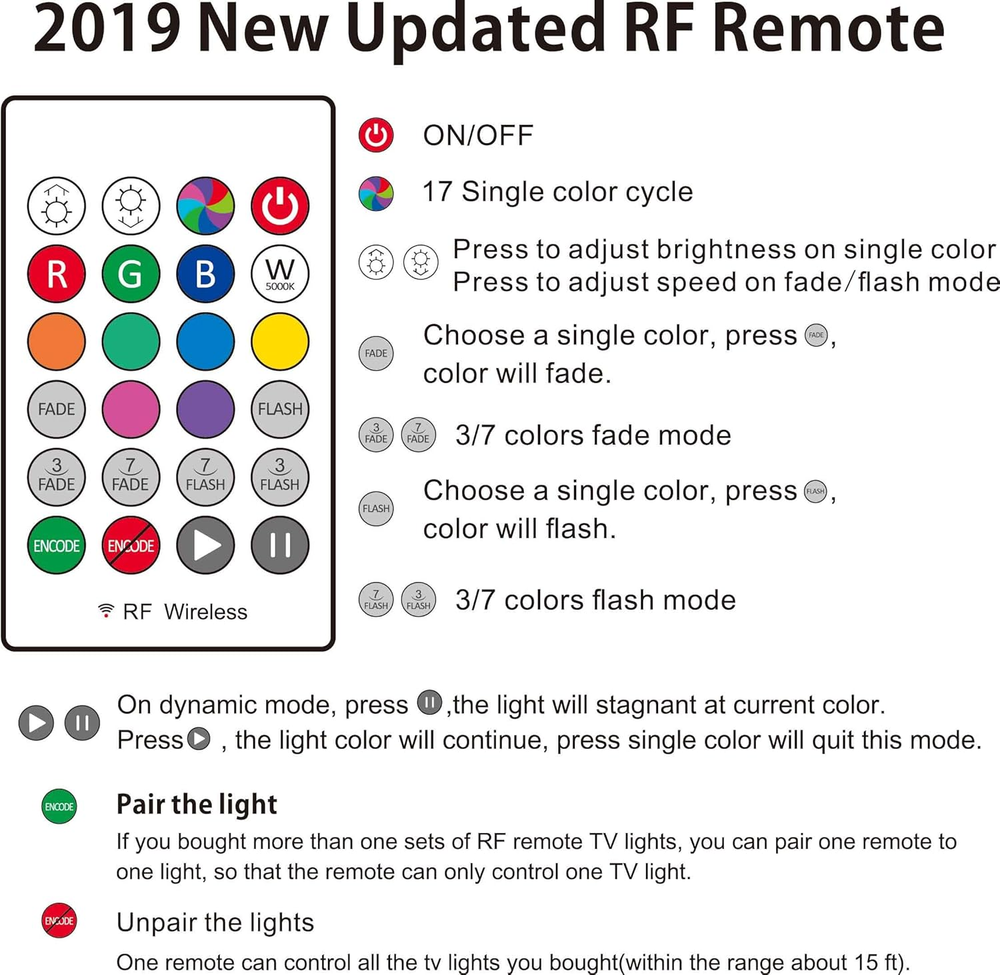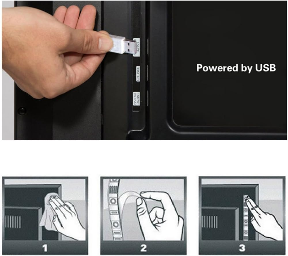 Store New Arrivals Add to Favorite View Feedback Contact Fast deliveries to the customer's home Quality customer service John Make the customers happy! USB TV Backlight Kit for 70 75 80 82 Inches Smart TV Monitor HDTV Work Space Decor - Cover 4/4 Sides behind TV Background Lights Ambient Mood Lighting Description TV lights for better TV viewing or video games experience and Relieve Eye Strain. Help to make a more comfortable environment when long watch watching and playing TV games Custom Version TV Backlight, can cover ALL the four sides of 70 to 82 inch TV Wireless RF Remote, 360 degree and 60ft MAX. control range, 17 colors(include white), with fade/flash mode Powered by USB of your TV, it will ON/OFF with your TV, but can not change with your TV's color; TV lights will remember the last color when off. LED strips itself is black, not noticeable; Easy to install, take 5 to 10 minutes Remote with Encode mode, it can control two more TV lights with one remote; or one remote to control only one TV. Feature: Applications: For 70"-82" behind TV lighting / Monitor Home / Theater decoration light. Size of LED Strip: 18 feet "S" shape featured black LED strips. LED Chip:RGB 3528 SMD LED, high intensity and reliability. Attation: The power of the light is 5W( DC5V, 1A), Please check USB output prior to use. Send email to us if you need any help. Question 1: How can the RGB LED tv light Relieve Eye Strain? Answer: When you are watching tv in a dark room, the tv is a bright and flickering lighting source. Looking directly at the light source for a long time could really cause eye pain and visual problems. It's like your mom may have told you: "Don't get too close to the tv and turn on a light when it's too dark. The tv light will gently light up your room and give you a wonderful watching time; most important, it will take care of your eyes. Question 2: Does the tv light turn on/off with the tv? Answer: For most of all tvs, the light will turn on/off with the tv. For a few kinds of tv, you need to use the remote. Question 3: Does the 3M tape will stay for a long time? Answer: Yes, the tape is 3M VHB tape, it will be more sticky when get heated(Working tv will generate heat). But please remember, clean the back surface of the tv before sticking. Question 4: Is this an RF or IR remote? Answer:This is a RF Wireless Remote(Updated). No need to worried the receiver. Question 5:I bought more than one sets of RF remote TV lights, and I want one remote to control only one TV, how to pair the remote with TV lights? Answer: 1), Unplug all TV lights from your TV. 2), Plug one TV light, and press "ENCODE" synchronously in 3 seconds when plugged. 3),TV light will flash once or twice, then paired. Light Source Type LED Item model number 55 Style Modern Number of Items 1 Power Source USB Powered Number of Light Sources 99 Control Method Remote Theme Movie Controller Type Remote Control Connectivity Protocol Radio Frequency Wireless Communication Technology Radio Frequency Assembly required No Batteries required Yes Material LED strip Number of Batteries 1 CR2 batteries required. (included) Form Factor Strip Lights Package Dimensions 8.98 x 7.32 x 0.47 inches Included Components Wireless remote with battery, USB cable, and adhesive tapes White Brightness 100 Lumens Indoor/Outdoor Usage Indoor Light Color Multicolor Water Resistance Level Not Water Resistant Item Weight 4.6 ounces Connectivity Technology Radio Frequency Special Feature Remote Controlled, Adjustable Color Temperature 5000 Kelvin Color Multicolor Is Discontinued By Manufacturer No Wattage 5 watts Batteries 1 CR2 batteries required. (included) Voltage 5 Volts Manufacturer Tech LTD Size For 70-82 inch TV ABOUT US We offer the best prices around on high quality products. Our E-store includes media such as books, movies, music and games while offering electronics, toys, sporting apparel, clothing, tools, general home, garden items and more. SHIPPING We are always working hard to ensure your package arrives as soon as possible. Please understand that some factors like weather, high postal traffic, and the performance of shipping companies are outside of our control. We offer free shipping to the lower 48 states and ship within 2 business days of payment, usually sooner. We do not accept P.O. Boxes. Please provide a physical address. For shipping outside of the continental USA, we only use eBay's Global Shipping Program. The item is shipped to KY and then sent to the rest of the world. International customers are responsible for all duties and taxes. Continue to 'check out' to calculate costs for shipping the item to your country. Messages regarding eBay's Global Shipping Program MUST be directed at eBay EXCLUSIVELY. RETURNS We offer a 30-Day Return Policy on items in which you are not completely satisfied with. You have the option of a full-refund or an exchange of the item. No returns are available on items shipped outside of the USA PAYMENT We accept PayPal. CONTACT US This page content is yet to come Please ad us to your favorite seller and visit again later Thank You CUSTOMER SATISFACTION We try our very best to make sure every customer is completely satisfied. If there's a problem, message us! We're happy to help. WE ACCEPT