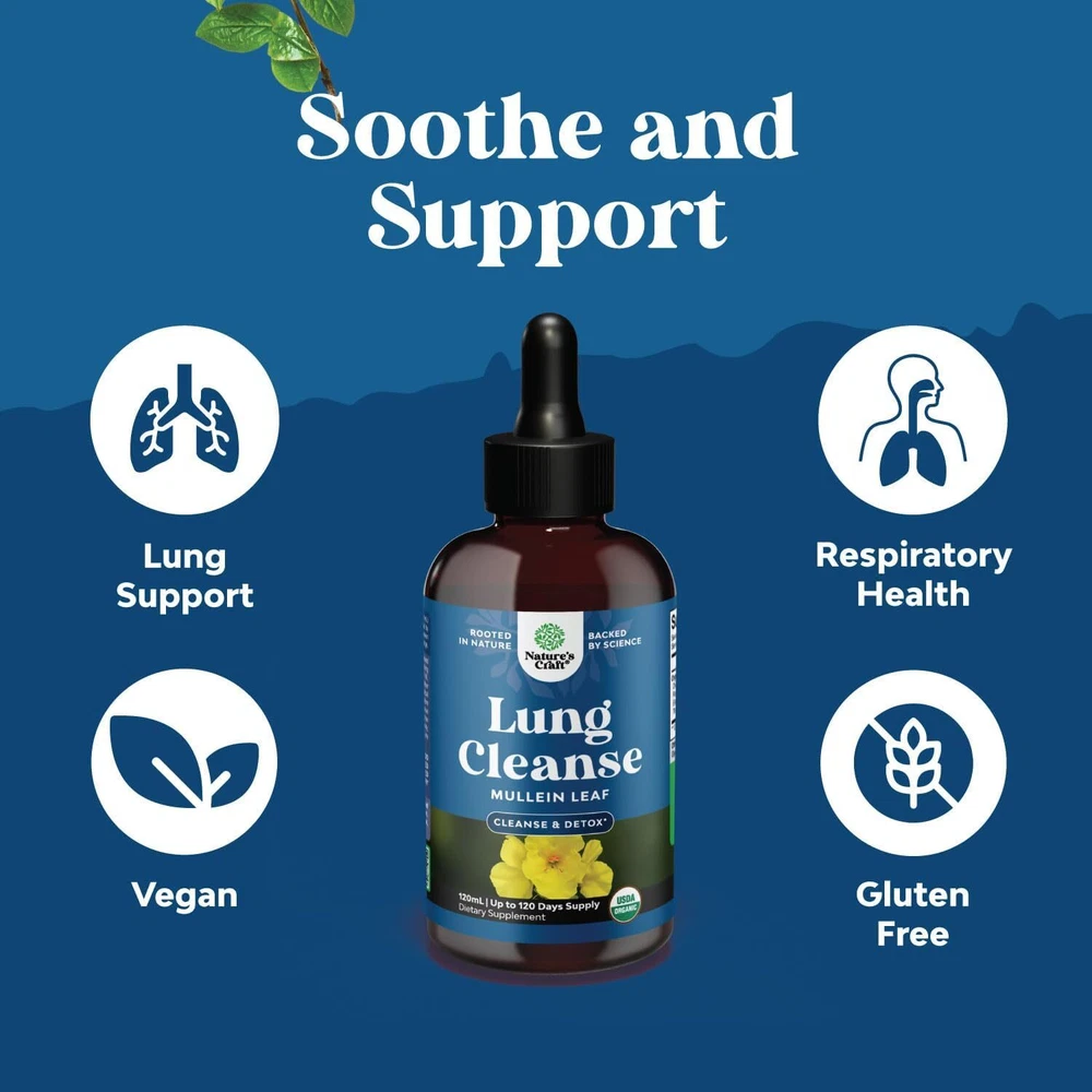 USDA Organic Mullein Drops for Lungs - Herbal Lung Detox & Cleanse with Marshmallow Root Extract & Plantain Leaf for Respiratory Lung Health - Mullein Leaf Tincture Drops for Breathing Support - 120ml Product Details Package Dimensions : 5.63 x 2.05 x 2.01 inches; 9.59 ounces Manufacturer : Natures Craft Brand: Natures Craft Item Form: Liquid Manufacturer: Natures Craft Item Package Quantity: 1 Package Information: Bottle Mullein Lung Cleanse - Help keep your pathways clean and clear with our mullein drops for lungs support made with an organic mullein herb blend that can help provide year round or seasonal discomfort Organic Mullein Leaf Tea Alternative - Mullein leaves are packed with beneficial flavonoids and our mullein leaf extract for lungs blend offers a stronger more bioavailable dose than teas and capsules Not your Basic Mullein Supplement - Mullein extract may be the superstar in our respiratory lung health supplements but our formula also has other cleansing botanicals like Elderberry & Thyme Clean Formula - Our vegan certified organic mullein oil blend is made in a GMP facility without Gluten Dairy Corn Sugar Soy Nuts GMOs Artificial colors and Alcohol because you deserve the best Natures Craft Quality - We are proud to be a leading name in herbal supplements for men women and children because we believe in utilizing the gifts from Mother Nature to support your wellness goals