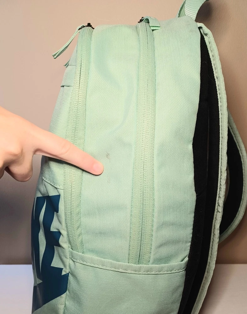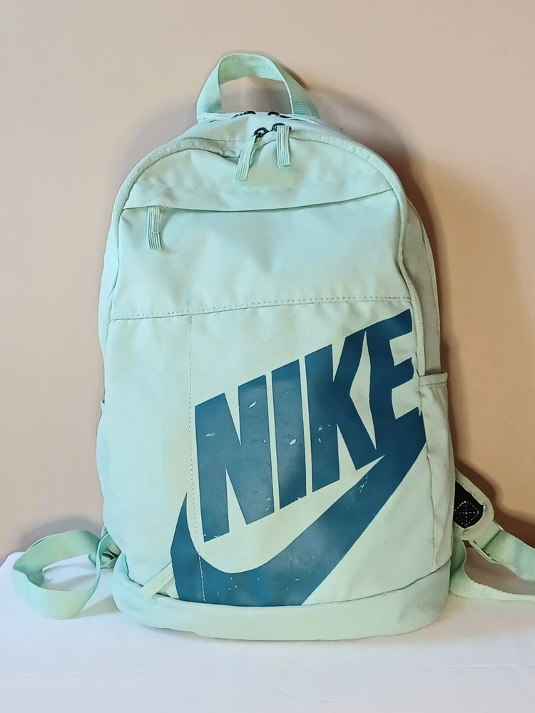 This Nike backpack is the perfect accessory for any sports enthusiast or school aged kid. The solid green color and classic design make it a versatile piece. The backpack features an adjustable strap and zip closure for secure and comfortable wear. With its spacious interior and multiple pockets, this backpack is perfect for carrying all your essentials on the go. Whether you're heading to the gym, running errands, or exploring the city, this Nike backpack is a stylish and practical choice. The product line is Nike 72 and it's made of durable polyester material. ATTENTION: This backpack has several small stains. Please look over the pictures before purchasing. All zippers are in working condition.