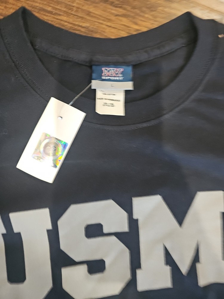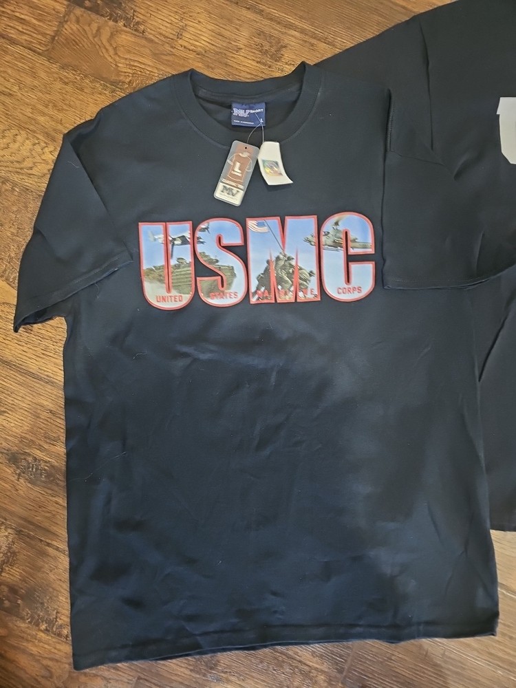 This lot of 2 USMC MV Sport T-shirts in size Large feature a black color with a graphic print design showcasing the Marine Corps Marine emblem. Made of cotton material, these short sleeve shirts have a crew neckline and a regular fit, suitable for all seasons including winter, summer, fall, and spring. Perfect for men looking to represent the Marine Corps with a stylish and comfortable T-shirt from a trusted brand like MV Sport. Machine washable for easy care, these shirts are a must-have addition to any man's wardrobe.