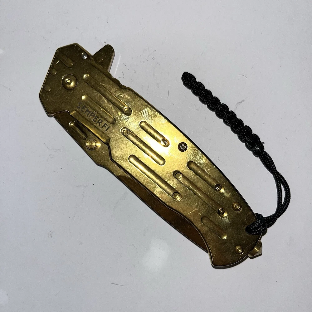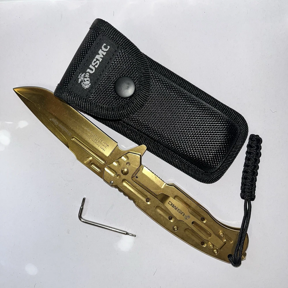Experience the legacy of the United States Marine Corps with this officially licensed tactical folding knife. Crafted with precision and designed for performance, this striking gold knife is a testament to the strength, courage, and unwavering dedication of the Marines. Built for Mission Readiness This isn't just a knife; it's a tactical tool engineered for demanding situations. The 9-inch overall length provides ample reach and control, while the lightning-fast ball bearing assisted opening mechanism ensures rapid deployment when seconds count. The ergonomic carbon steel grip with a grid pattern provides a secure and comfortable hold, even in the most challenging conditions. Essential Features for Tactical Use: Officially Licensed USMC: Authentic product with a striking gold finish, honoring the legacy of the Marines. Rapid Deployment: 9" overall length with a fast and smooth ball bearing assisted opening mechanism for quick access. Enhanced Grip: Ergonomic carbon steel grid grip for a secure and comfortable hold in any situation. Durable Construction: Built for tough use with a reliable liner lock to ensure blade safety. Convenient Carry: Includes a hard nylon belt case for secure transport and easy access. Extra Features: Alan key for tightening screws, reversible pocket clip, and a pocket lanyard for added utility. Perfect for: USMC Enthusiasts: A must-have for any Marine Corps fan or collector. Military Personnel: A reliable and tactical tool for active-duty and retired military personnel. Everyday Carry (EDC): A versatile tool for everyday tasks and emergency situations. Tactical Gear Collectors: A valuable addition to any tactical gear collection. Outdoor Enthusiasts: Ideal for camping, hiking, hunting, and other outdoor activities. Customer Satisfaction Guaranteed We strive for 100% customer satisfaction. If you experience any issues with your purchase, please contact us directly before leaving any feedback or opening any claims. We will work diligently to resolve any problems promptly and efficiently. Order Your USMC Tactical Gold Knife Today Experience the power and prestige of the United States Marine Corps with this exceptional tactical folding knife. Order yours today and join the ranks of those who demand the best.