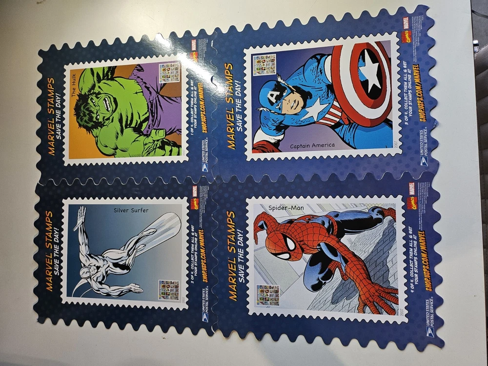 This is a rare and collectible set of four USPS promo stamps featuring Marvel characters and artwork by Greg Land. The stamps were released in 2007 and are part of a puzzle series. They are in excellent condition and are a must-have for any Marvel fan or stamp collector. The stamps feature some of the most iconic Marvel characters and are a great addition to any collection. Don't miss out on this opportunity to own a piece of Marvel history!