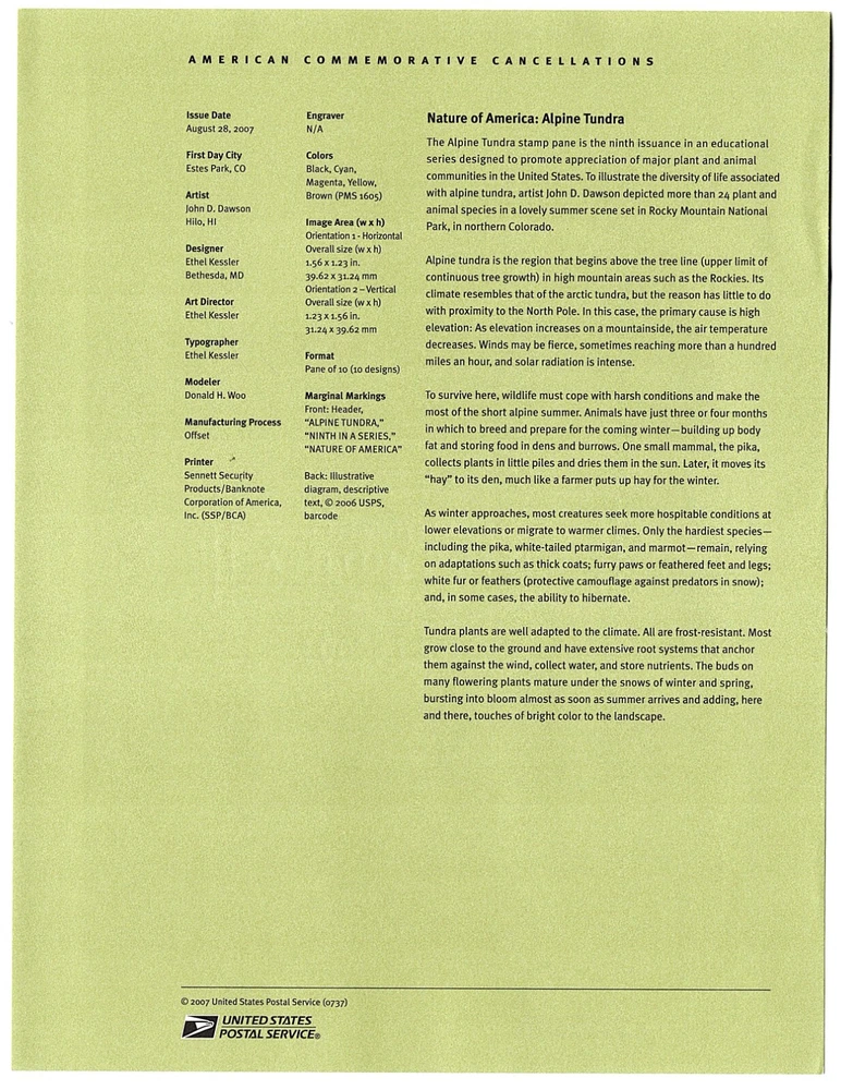 USPS Double Sided Souvenir Cancellation Page - $4.10 Alpine Tundra, August 28, 2007, # (20)07-37, Scott # 4198, Page # SP1660. 2022 Scott Catalog - $9.00; 2021 Brookman - $15.00. Shipping cost $3.00, USPS First Class. Ship this page with any other within 3 days for an additional $1.00 This is a new account to allow me to simplify searching - see my feedback at 3kittysgolf.