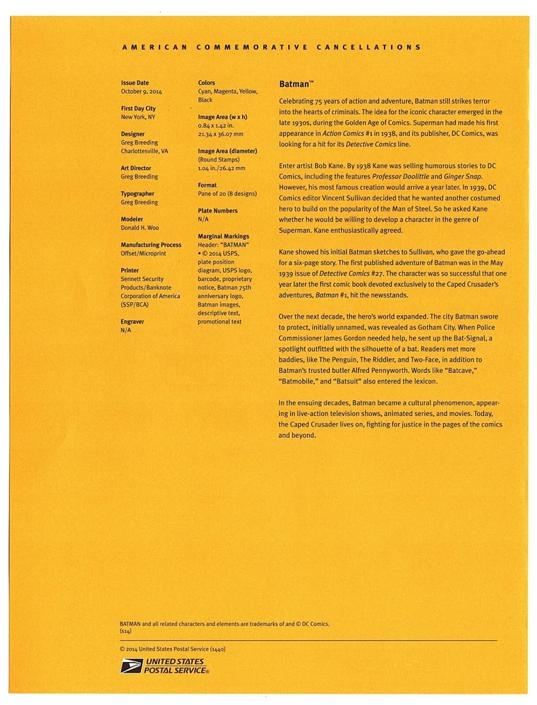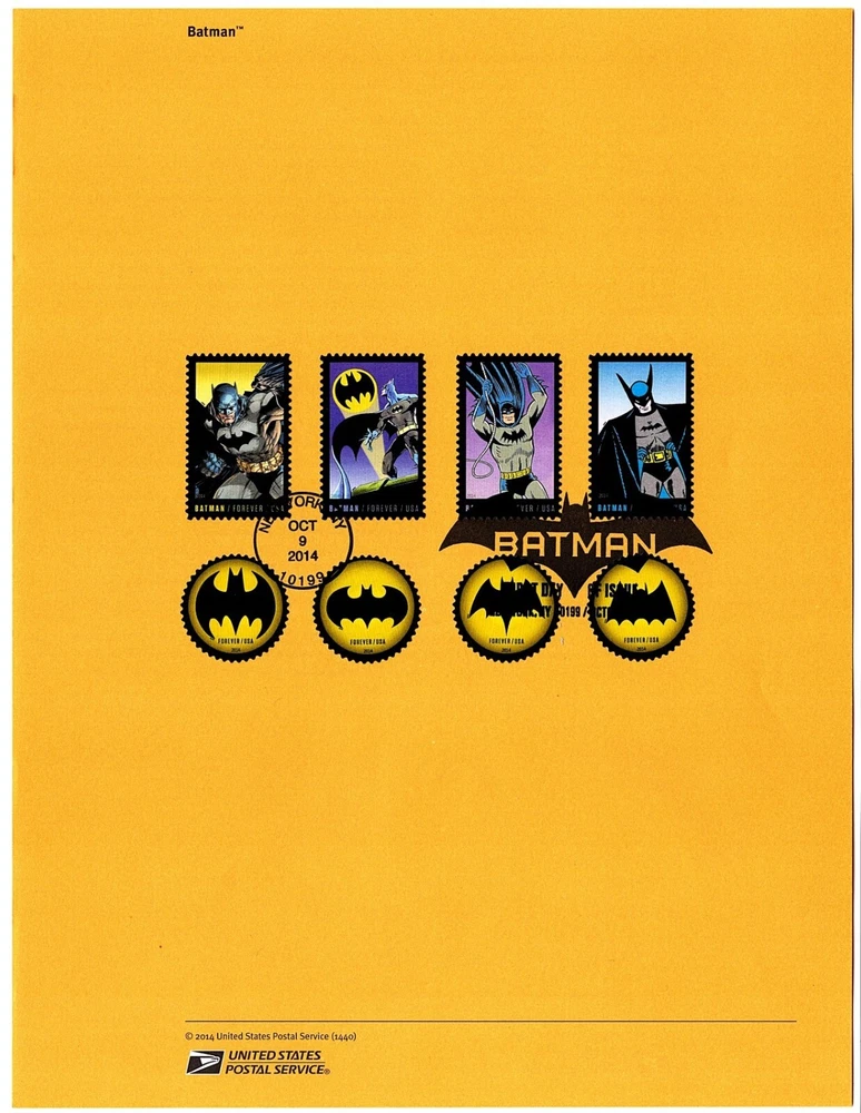 Double-sided USPS Souvenir Cancellation Page - Batman, October 9, 2014, # (20)14-40, Scott # 4928 - 4935a, Page # SP1954. 2022 Scott Catalog - $9.00; 2021 Brookman - $20.00. Shipping cost $3.00, USPS First Class. Ship this page with any other within 3 days for an additional $1.00 This is a new account to allow me to simplify searching - see my feedback at 3kittysgolf.