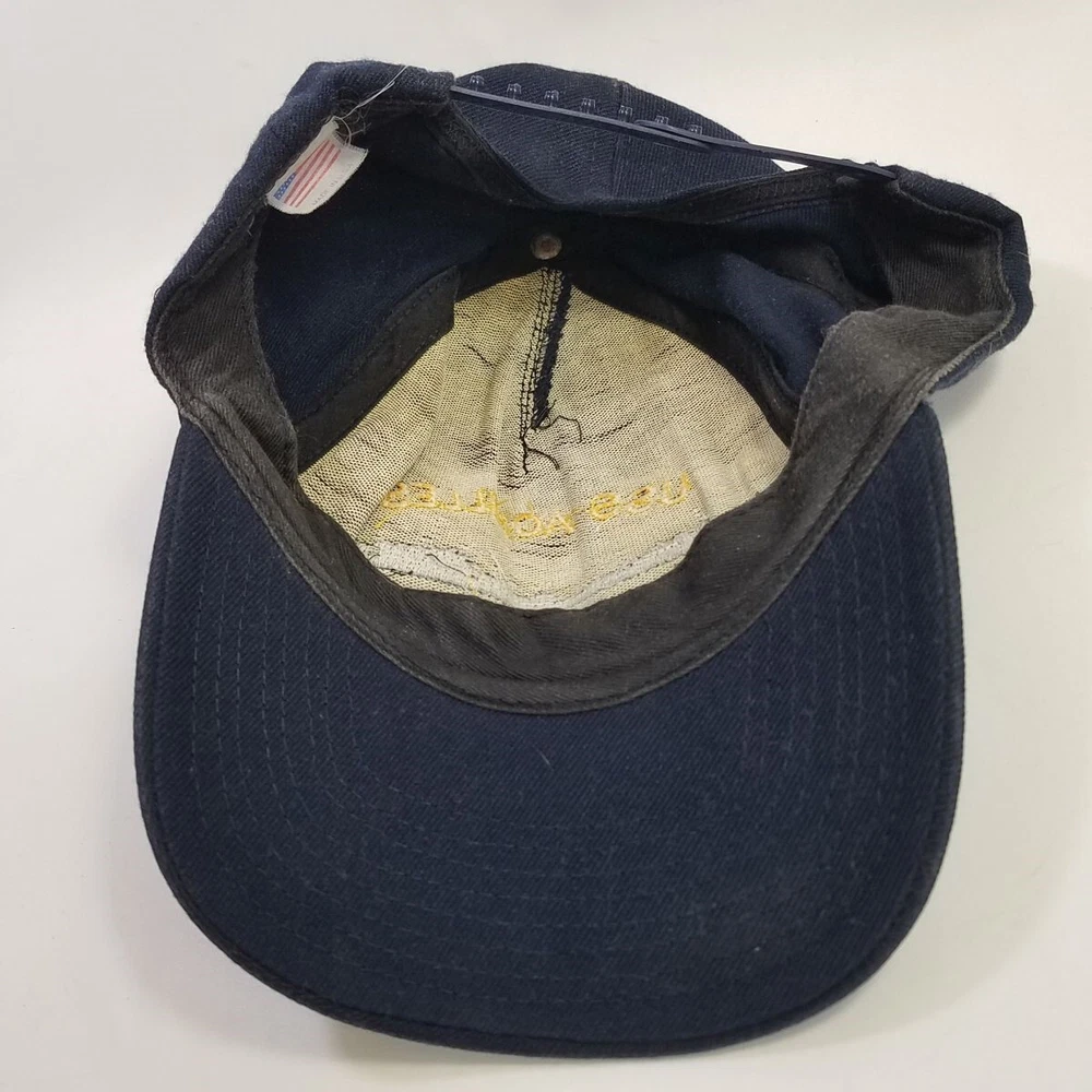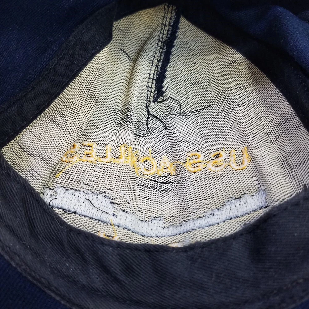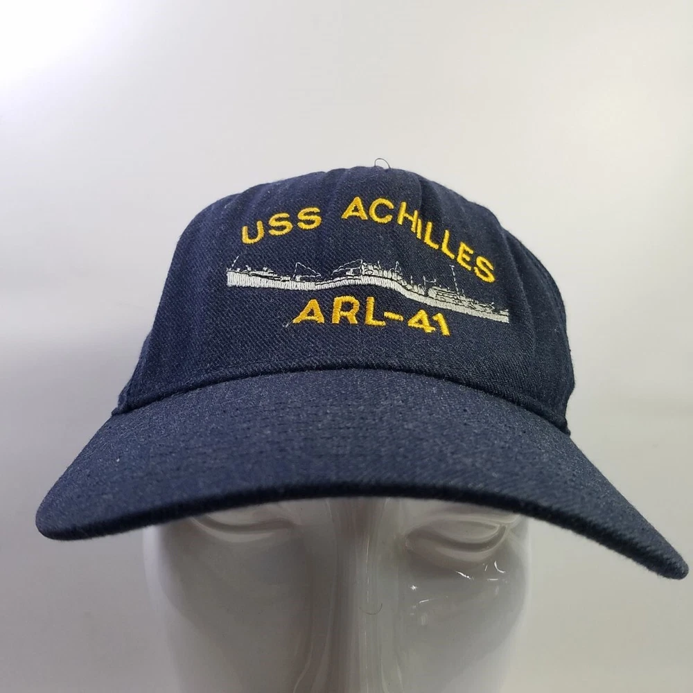 USS Achilles ARL-41 Embroidered Snap Back Cap Hat Navy Blue In good used condition. Outer fabric is clean without tears or stains. The sweatband has signs of wear, as shown in photos. Nice embroidered cap. No materials tag. The fabric is a woven twill. A cap with this ship name is a little uncommon to find. After a long period of good service in WWII, the Achilles was struck from the Navy Register in 1946, and no other US Navy ship has had the name. The cap is clearly much newer than WWII (has a fairly recent made in USA tag), but someone must have wanted a USS Achilles remembrance. Cap is dark navy twill with bright yellow-gold thread for the lettering, plus grey and black for the ship stitching. It may have been custom stitched. All images are photos or scans of the exact item you will receive. No stock or re-used photos. Please review images and condition notes, and feel free to ask any questions you may have. We are pleased to offer international shipping. However, international buyers please note that import duties, taxes, and charges aren't included in the item price or postage cost. These charges are the buyer's responsibility. Please check with your country's customs office to determine what these additional costs will be, prior to bidding or buying. We are also happy to combine shipping on multiple purchases. To combine shipping, place the items in your cart, but do not pay. Open your cart and you should see a link that says "Request Invoice" or "Request Total", usually located somewhere toward to the top right of the cart. Click on the link. When we receive the request we will get your items weighed and packaged, and send you an invoice with combined shipping. This will happen either the same or next business day depending on time of request. You will receive a message from Ebay with the invoice and can make your payment from there. If it's not convenient for you to wait for an invoice or you have trouble finding the link, feel free to go ahead and buy the items. We will refund the difference after shipping. Thanks for your interest!