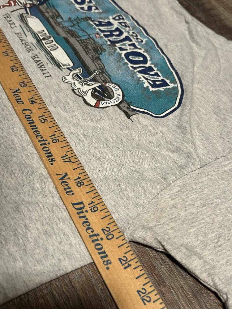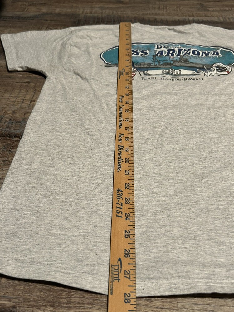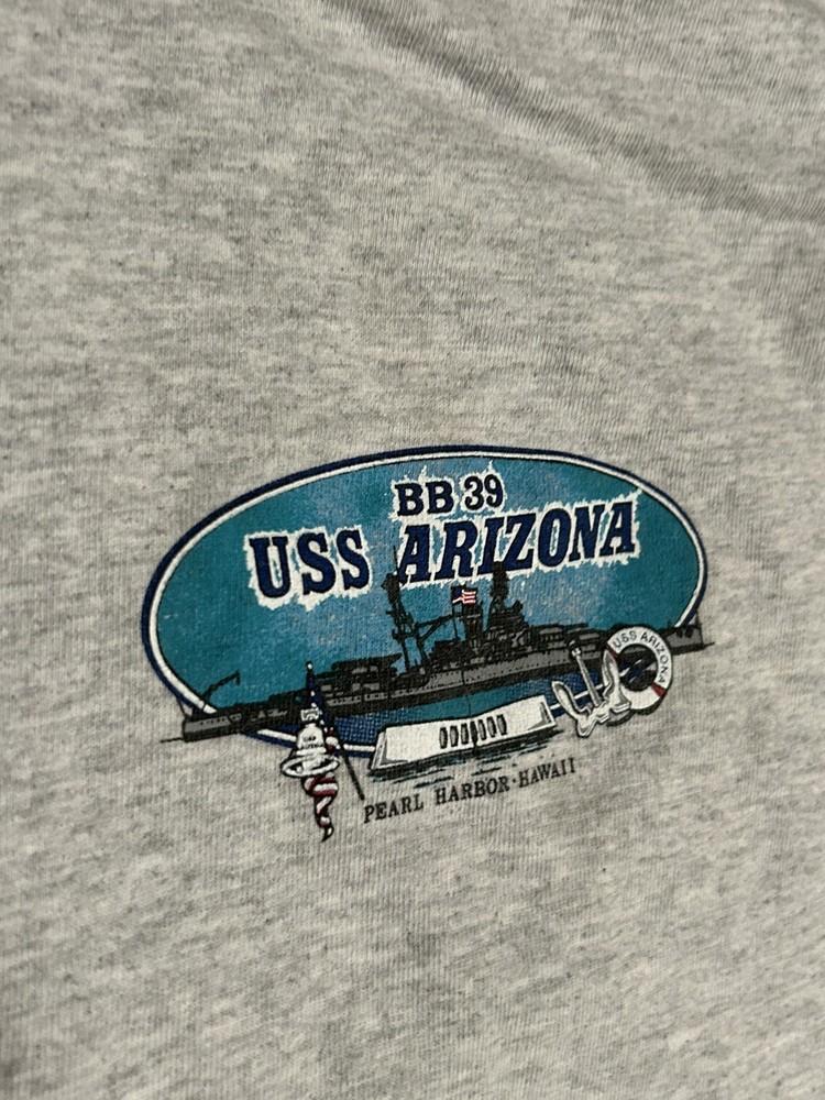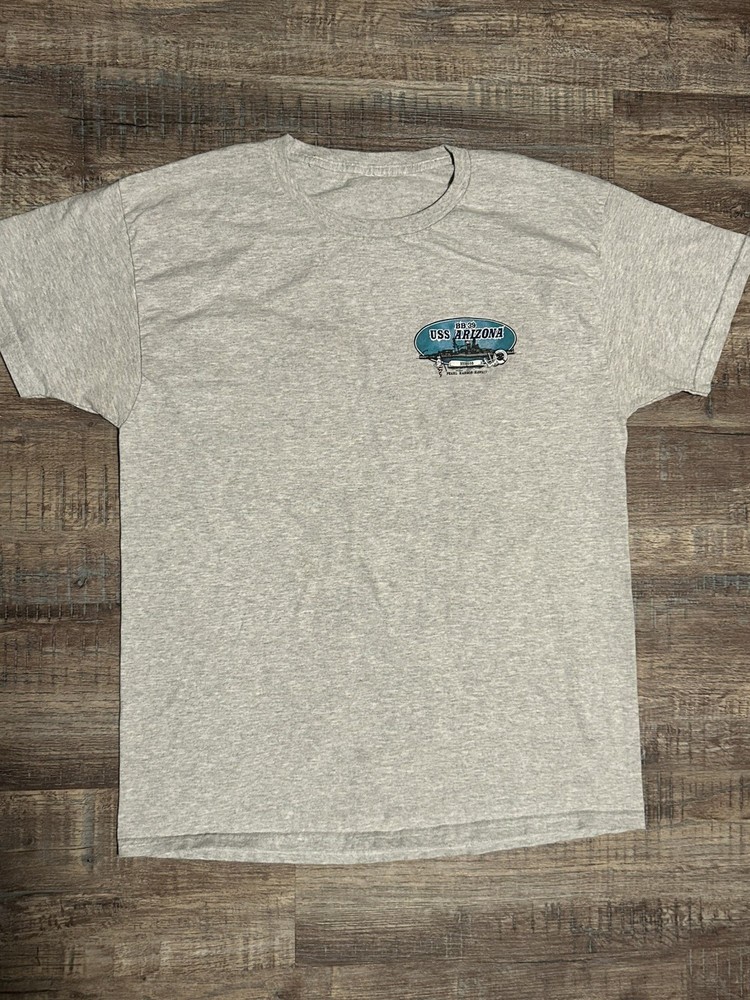 The USS Arizona Pearl Harbor Hawaii Vintage Short Sleeve T-Shirt by Combat Collection is a classic piece of men's clothing. This gray shirt features a design inspired by the historic Pearl Harbor site in Hawaii, making it a meaningful and unique addition to any wardrobe. The medium size and regular fit ensure a comfortable and flattering silhouette, while the short sleeves provide a breathable and casual look. Perfect for any man looking to add a touch of history and nostalgia to his everyday style.