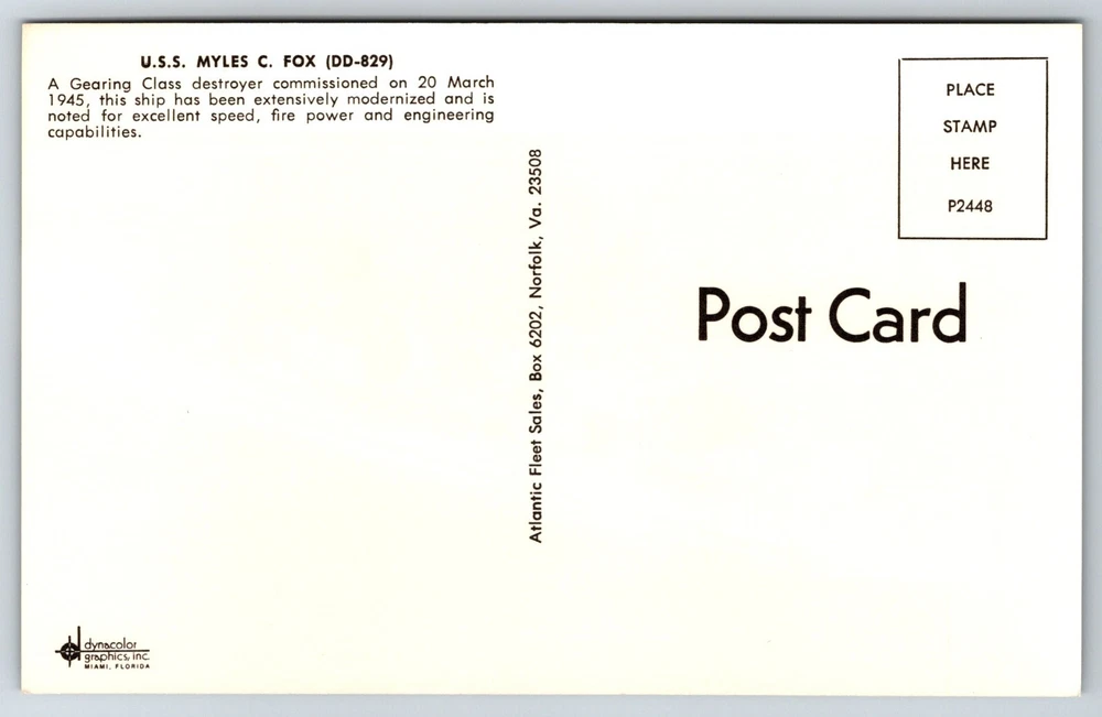 You are buying a Vintage " U.S.S. Myles C Fox DD 829 Navy Gearing Class Destroyer Photo Postcard . " Card Size is approx. 3.5" X 5.5". In stock, Usually Ships Within 24 hours! 100% Satisfaction Guaranteed! If you have any problems with this purchase, please contact me before leaving feedback, and I will do my absolute best to make you satisfied. Check all my other listings in my store. RETIREDWITHBOOKS. Thank you!