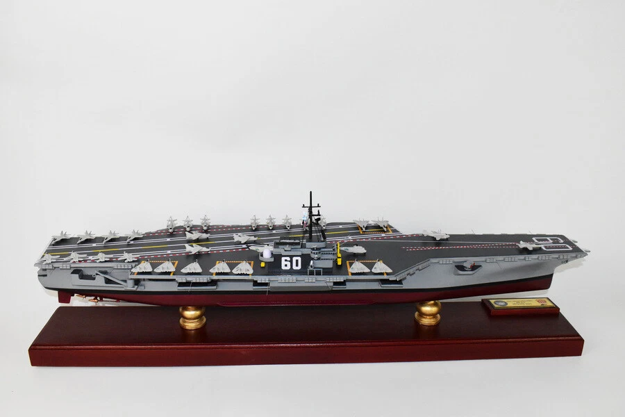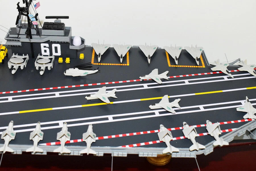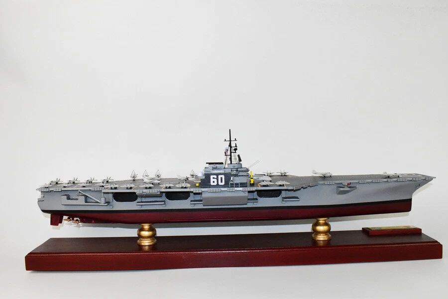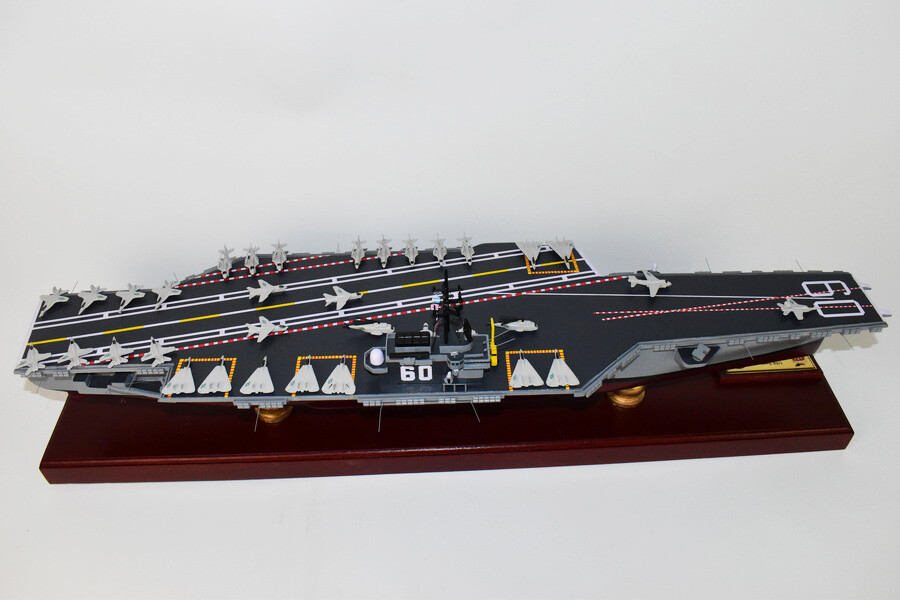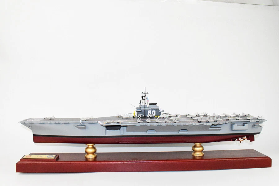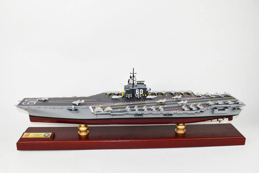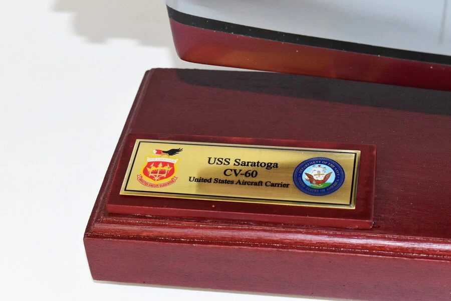 USS Saratoga CV-60 Aircraft Carrier Model Fly off of the USS Saratoga CV-60 Aircraft Carrier Model in this handcrafted wooden model. Each model is carved from wood and handcrafted to provide a piece you'll love. Length- 36 inches Made from Mahogany US Veteran Owned Business The product is not intended to be used by children 12 years and younger. USS Saratoga (CV/CVA/CVB-60), was the second of four Forrestal-class supercarriers built for the United States Navy in the 1950s. Saratoga was the sixth U.S. Navy ship, and the second aircraft carrier, to be named for the Battles of Saratoga in the American Revolutionary War. Commissioned in 1956, she spent most of her career in the Mediterranean, but also participated during the Vietnam War, receiving one battle star for her service. One of her last operational duties was to participate in Operation Desert Storm. Saratoga was decommissioned in 1994, and was stored at Naval Station Newport in Newport, Rhode Island. Multiple unsuccessful attempts were made to preserve her as a museum ship. The Navy paid ESCO Marine of Brownsville, Texas, one cent to take the ship for dismantling and recycling. On 15 September 2014, ex-Saratoga arrived in Brownsville, Texas, to be scrapped. Scrapping was completed by early 2019. Construction and trials She was ordered as a "Large Aircraft Carrier", hull classification symbol CVB-60, and her contract was awarded to the New York Naval Shipyard of Brooklyn, New York on 23 July 1952. She is the second of the four Forrestal-class carriers. She was reclassified as an "Attack Aircraft Carrier" (CVA-60) on 1 October 1952. Her keel was laid down on 16 December 1952. She was launched on 8 October 1955 sponsored by Mrs. Charles S. Thomas, and commissioned on 14 April 1956 with CAPT Robert Joseph Stroh in command.[3] She was the first carrier in the US Navy to use high-pressure 1,200 psi (8,300 kPa) boilers.