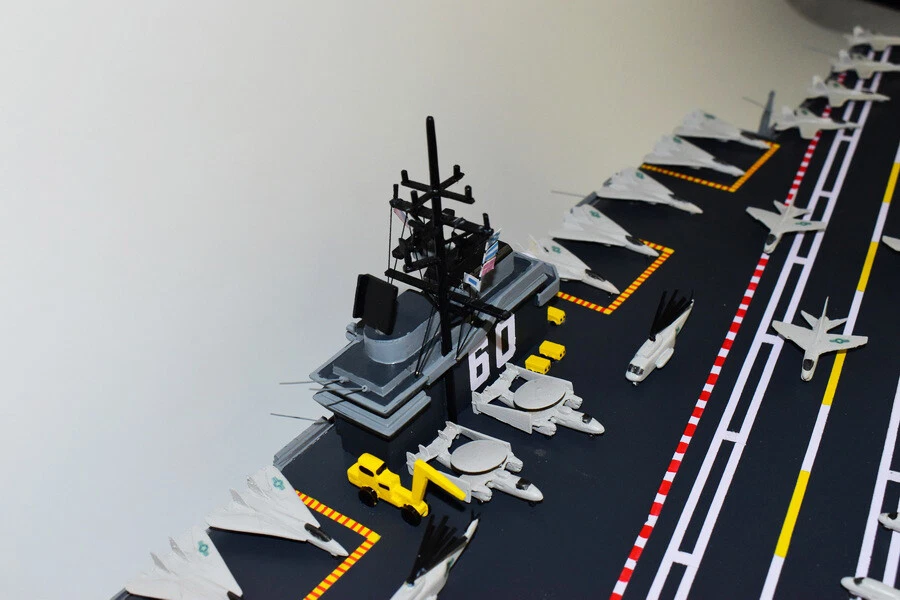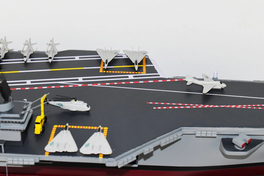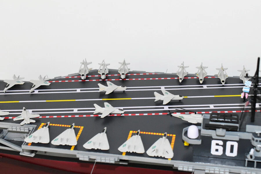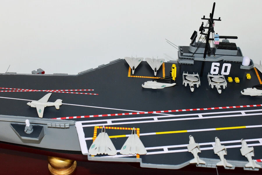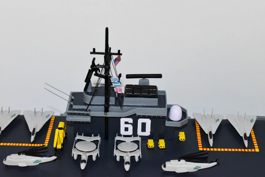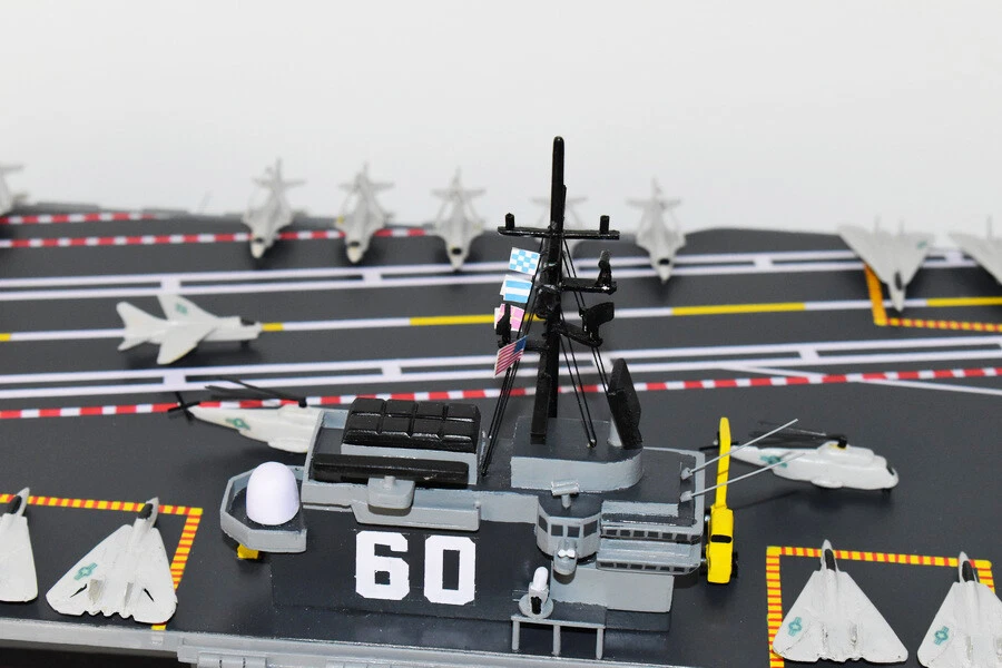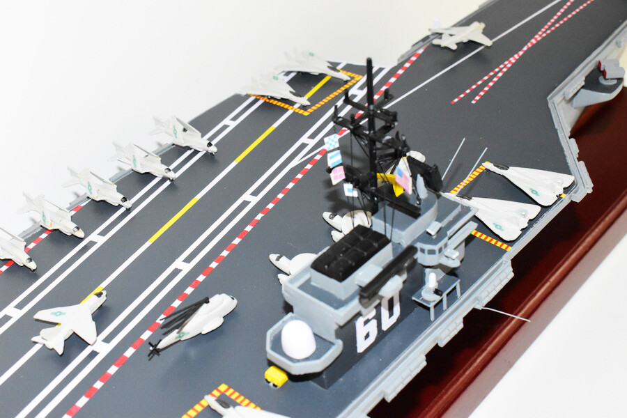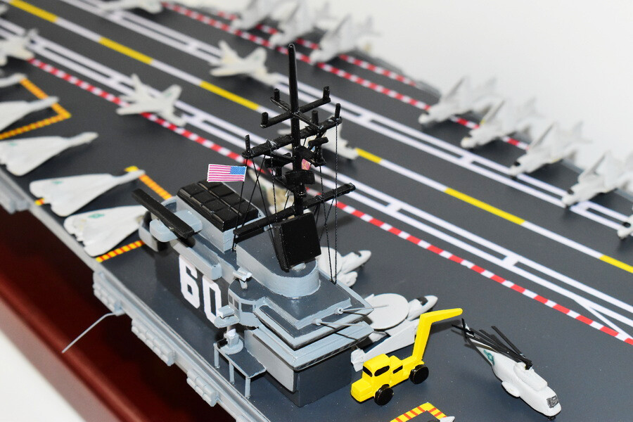 USS Saratoga CV-60 Aircraft Carrier Model Fly off of the USS Saratoga CV-60 Aircraft Carrier Model in this handcrafted wooden model. Each model is carved from wood and handcrafted to provide a piece you'll love. Length- 36 inches Made from Mahogany US Veteran Owned Business The product is not intended to be used by children 12 years and younger. USS Saratoga (CV/CVA/CVB-60), was the second of four Forrestal-class supercarriers built for the United States Navy in the 1950s. Saratoga was the sixth U.S. Navy ship, and the second aircraft carrier, to be named for the Battles of Saratoga in the American Revolutionary War. Commissioned in 1956, she spent most of her career in the Mediterranean, but also participated during the Vietnam War, receiving one battle star for her service. One of her last operational duties was to participate in Operation Desert Storm. Saratoga was decommissioned in 1994, and was stored at Naval Station Newport in Newport, Rhode Island. Multiple unsuccessful attempts were made to preserve her as a museum ship. The Navy paid ESCO Marine of Brownsville, Texas, one cent to take the ship for dismantling and recycling. On 15 September 2014, ex-Saratoga arrived in Brownsville, Texas, to be scrapped. Scrapping was completed by early 2019. Construction and trials She was ordered as a "Large Aircraft Carrier", hull classification symbol CVB-60, and her contract was awarded to the New York Naval Shipyard of Brooklyn, New York on 23 July 1952. She is the second of the four Forrestal-class carriers. She was reclassified as an "Attack Aircraft Carrier" (CVA-60) on 1 October 1952. Her keel was laid down on 16 December 1952. She was launched on 8 October 1955 sponsored by Mrs. Charles S. Thomas, and commissioned on 14 April 1956 with CAPT Robert Joseph Stroh in command.[3] She was the first carrier in the US Navy to use high-pressure 1,200 psi (8,300 kPa) boilers.