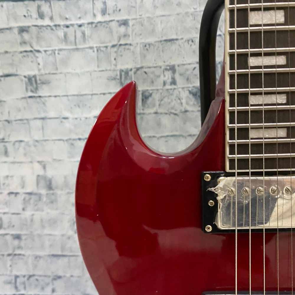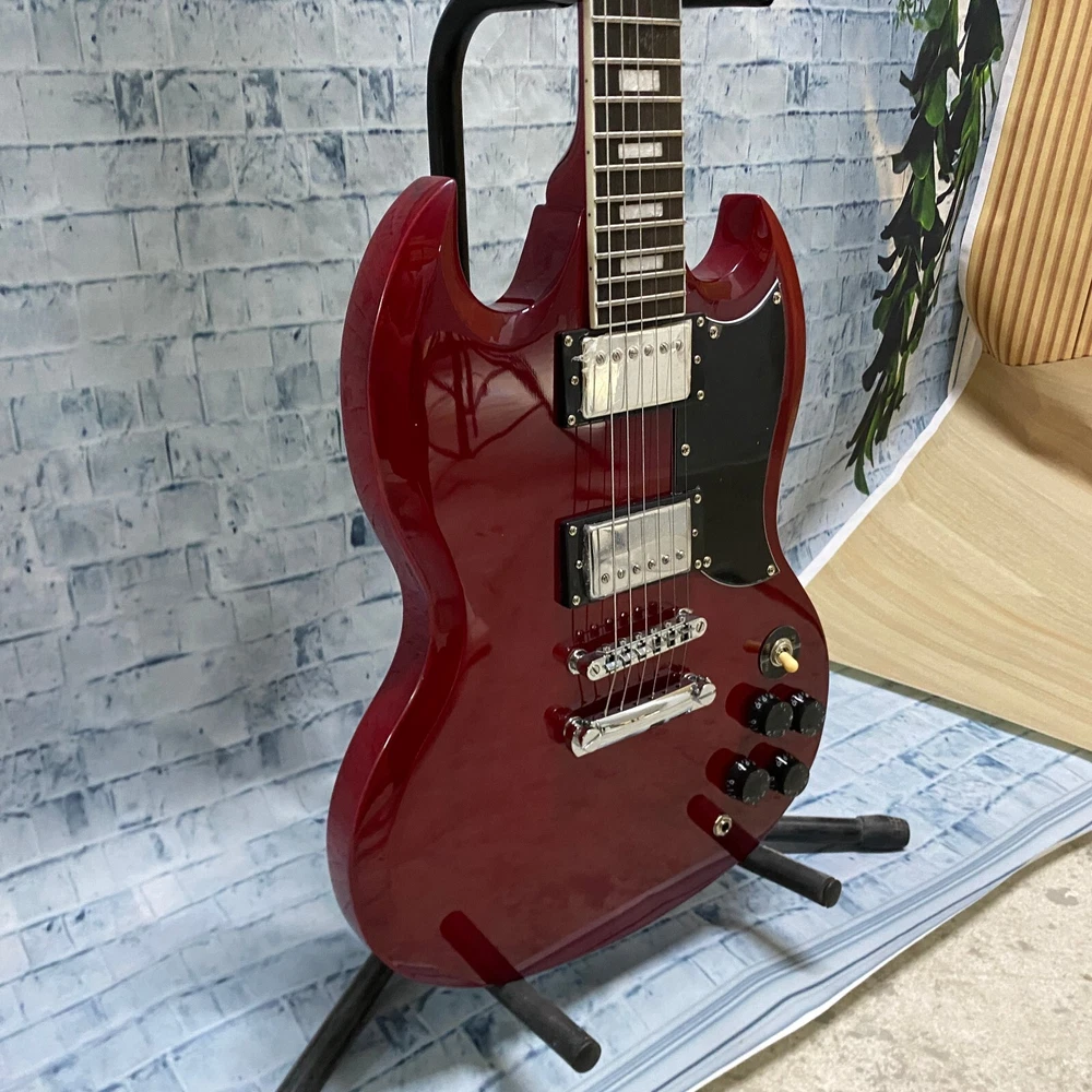 This is a professional-level SG electric guitar in metallic red with a solid mahogany body and mahogany neck. It has 22 frets on a rosewood fretboard, featuring chrome hardware. The set includes a cable, and it is a 6-string right-handed electric guitar from the 2024 Custom series, made in China.