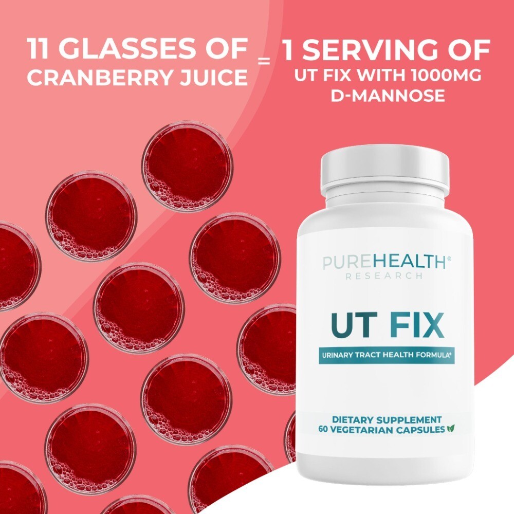 Product Overview D-Mannose with Cranberry + Propolis and other ingredients are well known to be very powerful and effective ingredients. D-Mannose 1000mg capsules with 300mg cranberry extract help maintain and control women's urinary tract health. This condition is not uncommon in men as well, but for women, these UTI capsules are a must-have. UT Fix Formula, a UTI supplement for women, is a long-term control method for improved health and peace of mind. Our D-Mannose capsules help relieve discomfort, reduce endless nighttime trips to the bathroom, and maintain and preserve better urinary tract health. The Cranberry D-Mannose Propolis blend is considered the easiest way to deal with any further bladder control issues while flushing your UTI out of the system. No more sleep interruptions or unnecessary pain - enjoy a better quality of life, because everyone deserves it. UT FIX by PureHealth Research is developed by our team of expert nutritionists and scientists. UT Fix supplements are gluten-free, dairy-free, soy-free, and non-GMO. Suggested Use As a dietary supplement, take 2 vegetarian capsules daily, preferably with a meal and water, or as directed by a healthcare professional. Storage Store in a cool, dry place. Avoid heat, light, and moisture
