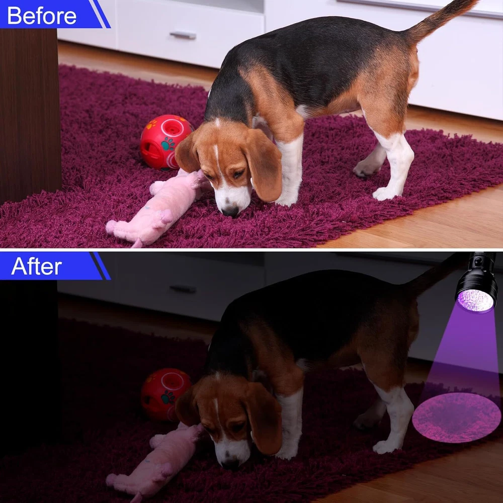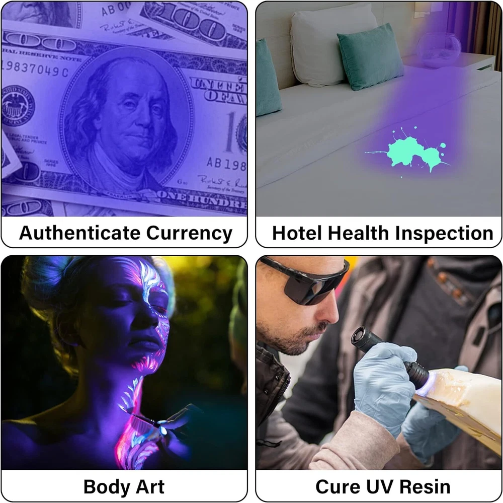 UV 51 LED Flashlight Ultraviolet Black Light 395nM Inspection with AA Batteries Features: 1. Use 3 AA Standard Alkaline Battery (Included) , Rechargeable batteries are not recommended (Size and Voltage is not compatible)! 2. Ensuring that you have a sufficient quantity for your needs; Ideal to stock up or ideal as a gift for your loved ones, especially for those who enjoy outdoor pursuits or need a UV light for both personal and professional use. 3. Broad Coverage : emitting a strong light with a wavelength of 395 nm, larger area than 9, 21 LED lights. the UV resin flashlight can cover a large area without reduction in the intensity of light; Whether you are scanning for pet stains or exploring the natural world in darker places, you can rely on this flashlight to do the job right. 4. Material and Construction : made mainly with an aluminum alloy, the UV flashlight for resin is sturdy; The surface bears a wear resistant, non slip texture grip that is waterproof and dust resistant to ensure that it lasts longer; It's crafted in a black color, and its compact size of about 5.66 x 2.22 x 1.37 inches, to adds to its usefulness. 5. Portable and Convenient : the blacklight for cat urine detection is designed to fit easily into a pocket and comes with a wristband for secure and comfortable carrying; Being lightweight, it can also be stored safely in a bag or backpack, offering you convenience on the go. 6. Multipurpose UV Flashlight : this UV flashlight is not only a pet cleaning tool for detecting pet urine stains on rugs, carpets, and clothes, but it also serves as a black light detector for scorpions, minerals, bugs, stains and fake currency; Suitable for outdoor use and serves as a nice tool for identifying currency, ID cards and more. 7. Tips: the 51 UV light LEDs have a lifespan of 15 years,To extend the flashlight’s life, please remove all batteries if you did not intend to use it for a long time. 8. Improper use or installation of poor quality batteries may cause product hazards that can affect our safety. We recommend the use of reliable high quality Alkaline batteries. Use of rechargeable or other non-recommended batteries VOIDS the manufacturer warranties. Specification: Color: Black Material: Aluminum with O rings for water resistance Size: 5.7 cm x 14.5 cm (DxH) 5.66" inches long & 2.22" inches across lamp Bulb Type: 395-400nm Bulb Life: 100,000 Hours Power Output: 5W Battery Required: 3 x AA Alkaline Battery Ni-MH 1.2V (Included). Battery Life: Approximately 20 hours on 3 AA batteries Switch Type: Click on / Click off Package include: 1 X UV Ultraviolet LED Flashlight Blacklight 4 X 1.2V AA Ni-MH Rechargeable Batteries 1 x Universal AA AAA USB Battery Charger 4-Slot On Jan 20, 2025 at 04:08:06 PST, seller added the following information: