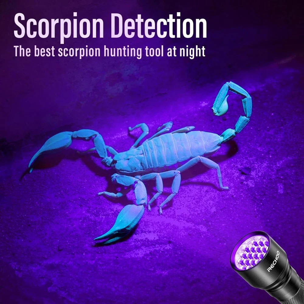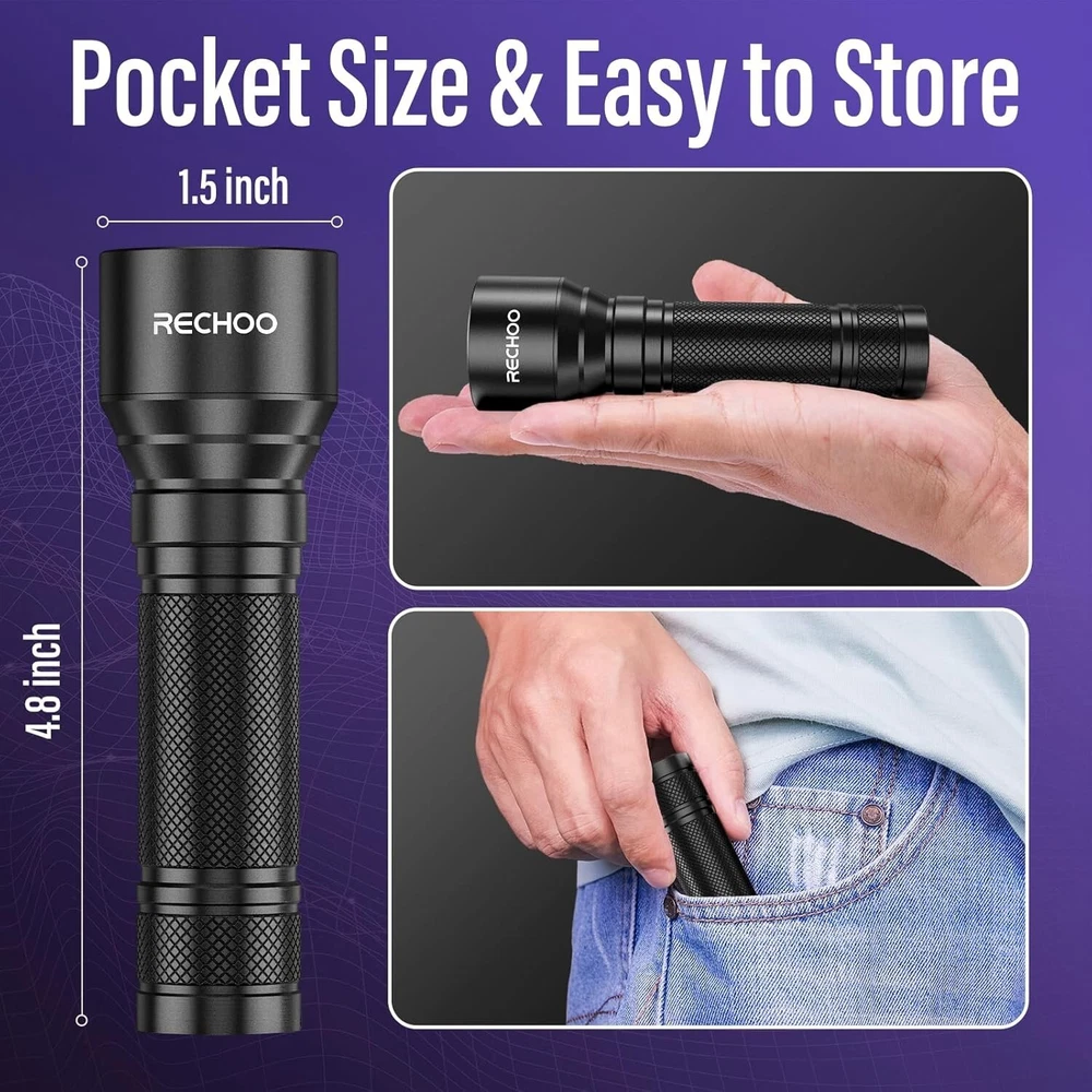 UV Flashlight Black Light, 21 LED 395nm Ultraviolet Rechargeable Flashlights UV Light, Waterproof Portable BlackLight Flashlights for Pet Urine Detection, Dry Stains, Bed Bug, Fluorescent Agent 395nm Rechargeable UV Flashlight: Our black light flashlight utilizes a newly upgraded 21 LED chip to provide 395nm wavelength for detecting any scenario involving fluorescent substances or invisible stains such as pet-dried urine stains on rugs, carpets, and clothes, covers a larger area than 12 LED lights; The UV light can also cure resin, make UV paints glow, uncover hidden cracks during repairs and authenticate currency and so on; The UV flashlights has versatile use; Long-Lasting Type-C Rechargeable Flashlights: Built in a high-capacity rechargeable battery, this black light offers a sustainable working life; Use the provided Type-C charging cable to connect the UV flashlight to any USB power source, such as your laptop, power bank, or car charger, for a swift and convenient recharging; Say goodbye to disposable batteries; Portable UV Flashlight for Versatile Use: Our small flashlight's compact design makes it easy to carry wherever you go; This black light is sturdy and lightweight enough to fit in your pocket backpack or glove compartment, and you'll always have reliable lighting at your fingertips; It's the perfect UV light for authenticating currency, official ID cards, and passports, detecting invisible ink pens, etc (Size: 4.9 inches * 1.5 inches, Weight: 0.24lb); Sturdy & Waterproof Blacklight: Crafted with high-quality military materials, our UV flashlight is built to satisfy the needs of everyday use; IP65 waterproof technology and seal design enable this UV lamp to be used in all bad weather; Whether you're discovering the hornworms on the plants or scorpion hunting, rest assured that our blacklight flashlight is up to your satisfaction;