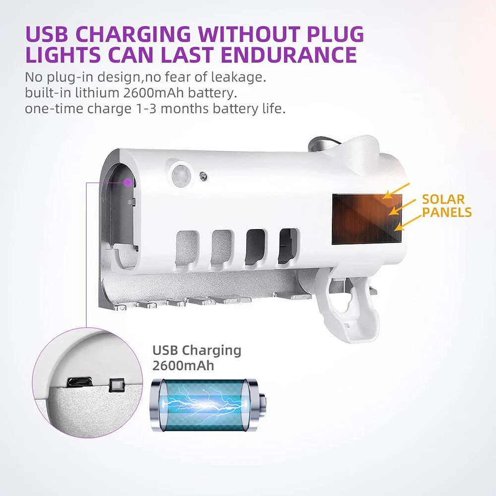 UV Light Toothbrush Sterilizer Holder Cleaner and Automatic Toothpaste Dispenser UV Light Toothbrush Sterilizer Holder Cleaner and Automatic Toothpaste Dispenser Features: 360° cleaning and continuous antibacterial, compact hollow design. Powered by solar energy and home lighting, no plugs, no need to replace batteries, safe and economical. This design can store toothbrushes, toothpaste, dental floss, tongue scraper, razor, towel, etc. The infrared sensor detects whether the human body is approaching, and the intelligent chip controls sterilization to ensure product safety. Improve the accuracy of squeezing toothpaste and reduce the waste of toothpaste. Instructions: Use a rag to clean the water stains and dust on the wall Tear off the backing board and stick it, be careful not to stick it backward Stick it on the wall for 2 hours Hang the toothbrush holder Turn on the power switch Hang the toothbrush, toothpaste and other supplies Specifications: Type: Induction Toothbrush Holder Color: White Material: ABS Dimensions: 7.68x3.54x1.77in Working Temperature: -15~50℃ Voltage : DC3.7V Input Current: 400mAh Power: 1.48W UV Lamp Power: 1.2W Package Includes: 1 x Toothbrush Holder 1 x Instruction Manual 1 x USB Cable 1 x Adhesive Listing and template services provided by inkFrog