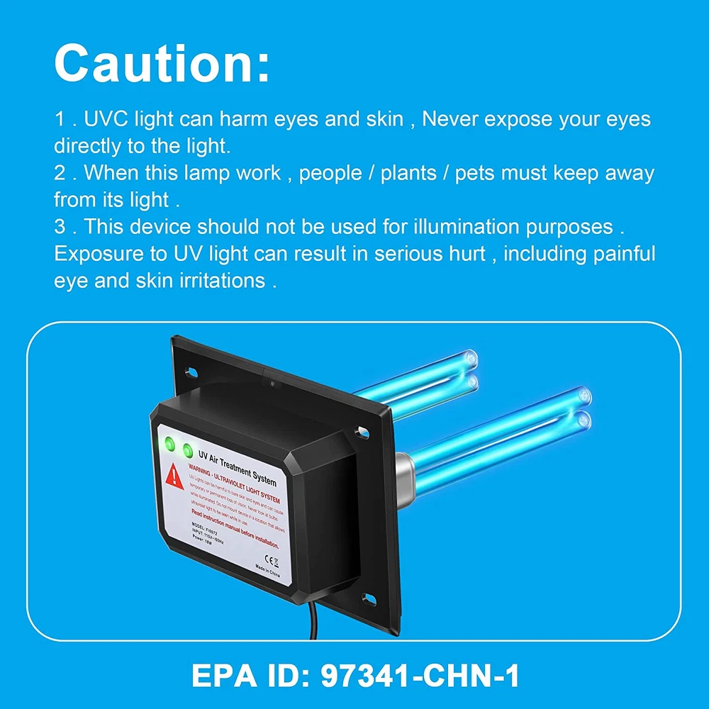 Specification: Voltage: 110V Wavelength: 253.7 NM Irradiation range: 600 SQ.FT Cable length: 4.6 ft (1.4 m) Power: 18 W UV dimension:UV: Dia 12 mm, length 164 mm Base dimension :177 x 126 x 74 mm UV lifetime: 13000 hours Function: sterilization Recommended use time: when install this lamp in HVAC ducts, recommended turning it on or off at the same time with fan. Package included: 1 x UV lamp holder (black) 4 x 9 Watts UV light tube (17.5 x 13 x 8 cm, 13 W) 1 x Manual How to installation: 1.Mark holes from the template included 2.Drill two 2 inch holes for the bulbs 3.Plug bulbs into the device 4.Place device onto duct 5.Install with 4 sheet metal screws 6.Plug device into any grounded 120 v outlet (up to 277 v) 7.Turn it on and you're DONE Note: 1. UV light can harm eyes and skin, Never expose your eyes directly to the light. 2. When this lamp work, people/plants/pets must keep away from its light. 3. When testing whether the lamp can work (after receive parcel), pay attention to using protection glasses or books/newspapers to block UV light from hurt eyes. READ SAFETY WARNINGS BEFORE YOU ORDER : This device should not be applied for illumination purposes. Exposure to UV light can result in serious hurt, including painful eye and skin irritations.