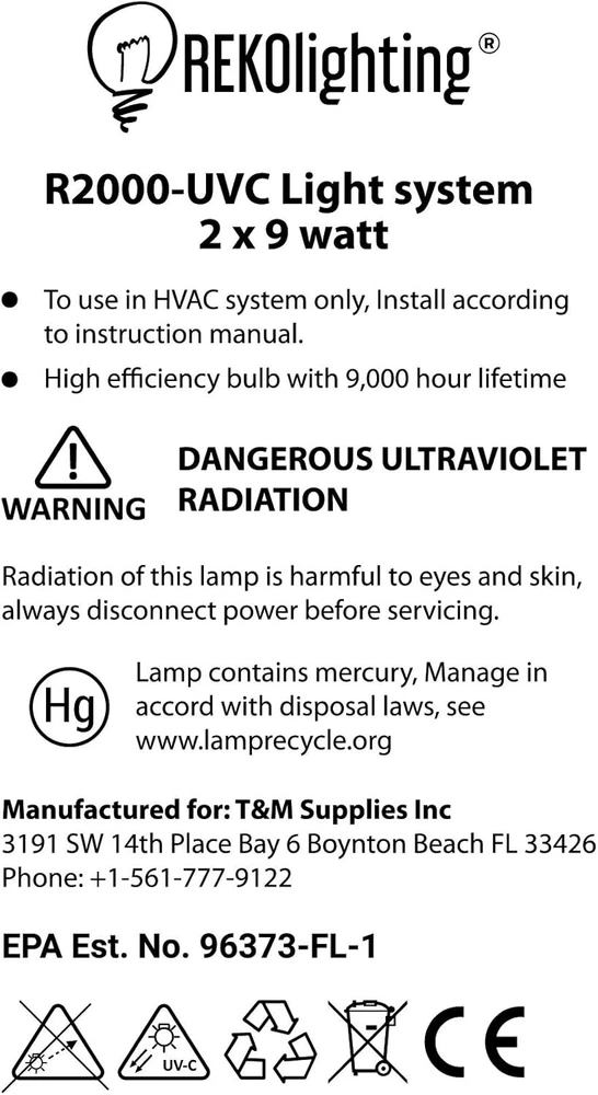 REKO Lighting R2000 Air Purifier/Cleaner HVAC UV Light System includes 2 x 9W UV-C Bulbs, High Efficiency 9000 Hour Lifetime BRAND NEW IN BOX - FACTORY SEALED BUY WITH CONFIDENCE, I HAVE 100% POSITIVE FEEDBACK! Have one of these in my town house, it seem like it has made a difference. We eventually decided to install them at my father's self storage business - he has a few old climate control facilities. However, he sold the entire business about 6 months ago, so selling the few units we had not installed yet. Brand new and unused, sealed in original factory packaging. Pictures show the exact item you will receive. All pics were taken by me today I listed this. I am not a professional seller but I have 100% positive feedback and am Top Rated with 5 Stars in each category, so you can count on everything being as described and pictured. Will ship fully insured & tracked with UPS, Fedex or 2 Day Priority Mail (most locations in US) . From manufacturer: Improve the air quality in your home with the REKO Lighting R2000 Air Purifier. This device is designed to eliminate harmful airborne particles and pollutants through its advanced filtration system. It is perfect for whole house applications and can be easily installed in your HVAC system. I t has a UV/UVC light that helps eliminate bacteria and viruses, ensuring that you breathe clean and healthy air. This air purifier is perfect for those who want to improve their indoor air quality and enjoy a healthier living environment. The REKO Lighting R2000 Air Purifier is manufactured by REKOLIGHTING, a trusted brand in the industry.