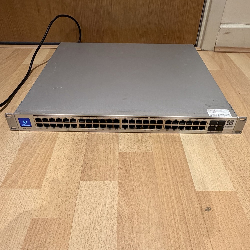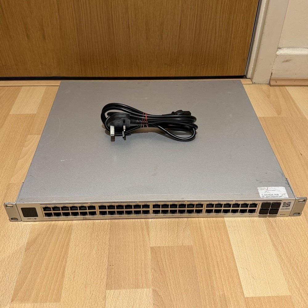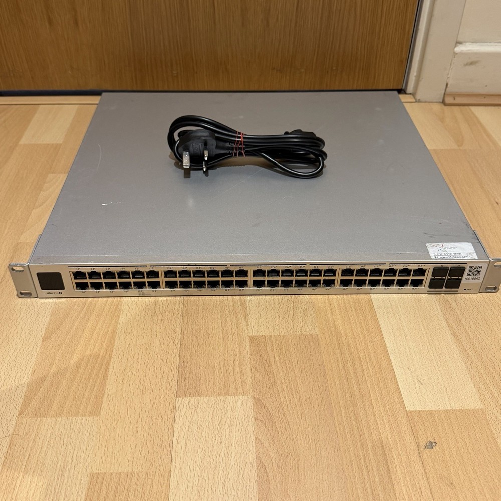 Ubiquiti UniFi USW-Pro-48-PoE (Model: USW-Pro-48-PoE). This is a professional-grade, Layer 3 managed switch featuring 48 Gigabit Ethernet ports and 4 10G SFP+ uplink ports. Key Features: • (40) PoE+ IEEE 802.3at/af Ports (Ports 1-40) • (8) 60W PoE++ IEEE 802.3bt Ports (Ports 41-48) • (4) 10G SFP+ Ports for high-speed uplinks. • 1.3" Color Touchscreen for real-time status monitoring. • Near-Silent Cooling making it suitable for office environments. • UniFi SmartPower RPS support for power redundancy. Condition & Testing: The unit has been powered on and the LCM (Liquid Crystal Monitor) is fully functional, as seen in the photos. All port LEDs cycle correctly during the boot sequence. The casing shows some minor cosmetic wear/scuffs from rack mounting, but is in overall good physical condition. Sold as Seen: This unit is being sold based on the provided photographs and power-on test. • Inclusions: Includes the switch and a standard UK power cable only. • Exclusions: No rack ears, original packaging, or additional networking cables included.