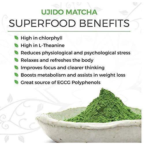 Ujido's Matcha green tea is carefully sourced from the highest quality tea leaves cultivated and hand-picked at the farm in Uji, Kyoto Japan. Traditional Japanese Matcha from 183 year old Uji City Manufacturer producing matcha by enviromental, traditional way. *** NOT MADE IN CHINA, NO HEAVY METALS*** Authentic covered tea garden for highest nutrition. Choice of the imperial families and Zen Buddhist monks. High quality control and low bacteria count. Tea Leaves are 100% genuinely hand picked. Stoneground and deep green color. High in chlorophyll. High in L-Theanine. Reduces physiological and psychological . Relaxes and refreshes the body. Improves focus and clearer thinking. Boosts metabolism and assists in weight loss. Great source of EGCG Polyphenols. Enhance Your Wellness: For over a millennium Matcha green tea has been used by many cultures for it's numerous benefits. Zen Buddhist monks use it as a means to relax and meditate while remaining alert, resulting from the unique amino acids in the tea leaves. Matcha can help to nourish, stimulate and protect your brain - enhancing your overall mood and leading to improved concentration. Increase your energy levels and endurance! Samurai warriors of early Japan drank Matcha Green Tea before going into battle due to the tea's energizing properties. While all green tea naturally contains caffeine, the energy boost received from Matcha is largely due to its unique combination of other nutrients. These properties can help stimulate your metabolism and aid in fat loss! Ujido's Matcha green tea provides powerful age-fighting antioxidants to protect your skin, and reduce inflammation in your body. Our Matcha tea leaves are of the highest quality for superior taste and benefits. VIBRANT & TENDER. Ujido’s Sweet Matcha is the ideal blend of 1st harvest ceremonial and 2nd harvest high culinary Matcha, so you get the flavor of ceremonial at the price of a quality culinary . This Matcha is shade grown and handpicked in early spring for vibrant and tender tea leaves before it is stone-ground. ANTIOXIDANT SUPERFOOD. This green tea has the natural superfood nutrition of L-Theanine, catechins, EGCG, and chlorophyll. Gluten free and keto friendly, this Matcha latte blend is sweetened with monk fruit and non-GMO erythritol for a naturally sweet, zero-calorie drink that has the rich Matcha tea flavor without the calories. DELICIOUS & SMOOTH. Sweet Matcha has a smooth, mellow, soothing flavor only found in superior quality Matcha. Mix with hot milk or milk substitutes for a sweet Matcha latte. It can also be mixed with water for a delicious Matcha tea, with ice water for a sweet iced tea, or in Matcha smoothies and low-sugar treats. JAPANESE HERITAGE. Ujido Matcha is grown in Uji, Japan, the birthplace of Matcha where Matcha has been produced for over 800 years. This is the same highly sought-after tea used in traditional Japanese tea ceremonies. SUPERIOR QUALITY. Ujido is a Japanese company providing real Matcha, not sencha or regular green tea from China like many others on the market. Our Matcha is grown in the foothills of Uji, where Matcha was born and is free from metals and radiation. We never use lower grades of Matcha from lesser regions. We live and breathe the Matcha lifestyle, from farm to latte.