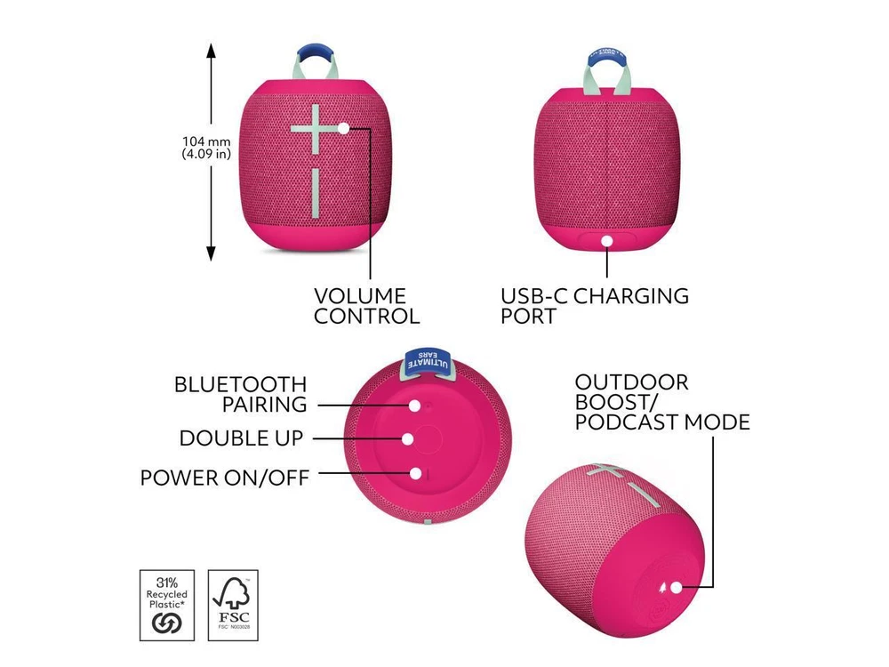 Ultimate Ears WONDERBOOM 4 Wireless Bluetooth Speaker - Pink Ultimate Ears WONDERBOOM 4 Wireless Bluetooth Speaker - Pink Features Surprisingly Bigger 360-Degree Sound: The WONDERBOOM 4 portable waterproof Bluetooth speaker features bigger 360-degree sound in a petite package; boosted sound for up to 14 hours of playtime Outdoor Boost and Podcast Mode: Engineered for full stereo sound; tap the Outdoor Boost button for outdoor environments; use the new Podcast Mode to make vocals sound rich and clear 14 Hours of Boom: With a battery that lasts throughout the day, this waterproof portable speaker booms on with up to 14 hours of playtime, so you can soak up every moment Waterproof, Dustproof, and Floatable: IP67-rated this Bluetooth waterproof speaker can be submerged in 1m of water for 30 min; protected from dust; ideal for the pool, beach, or shower Double Up for Stereo: Pair up two WONDERBOOM 4 portable Bluetooth speakers for even bigger sound; press once to double up; press again for true stereo from both speakers, with left and right channels Durable Wireless Speaker With Range: 131 feet (40 meters) of range so youre free to roam; plus its dirt-resistant and drop-proof (1) with a handy loop so you can take it with you Made With Recycled Plastic: Plastic parts in the WONDERBOOM 4 wireless Bluetooth speaker include a minimum of 31% post-consumer recycled plastic by weight (1) Drop-tested from 5 ft / 1.5 m Fast and Free Shipping You're already purchasing the item. Why pay additional for shipping, especially slow shipping? We get your order shipped out within 1-business day and delivered to your doorstep as quickly as possible. Competitive Pricing With our dynamic pricing model, our prices are always competitive. Our prices are some of the lowest that you will find on the internet. Rest assured that you're getting a good deal when purchasing with us. 30-day Money Back Guarantee We are committed to making sure that you leave this transaction satisfied. If you're unhappy with the product for any reason, you may return it back for your money-back or a replacement within 30 days. No questions asked!