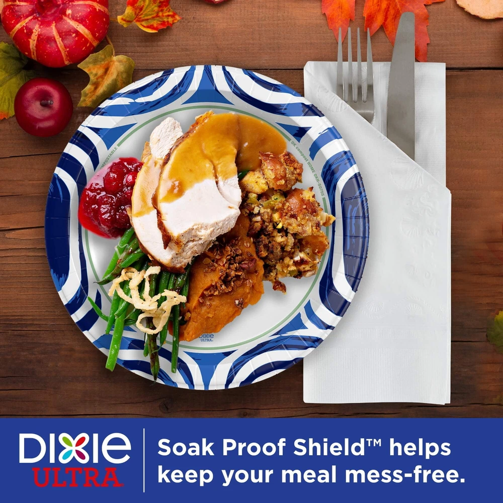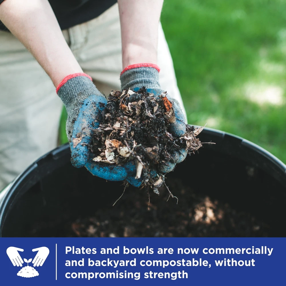 New look, same great disposable paper plates - now commercially and backyard compostable! Serve your favorite foods with confidence on disposable plates without having to worry about food bending, spilling, or sauce soaking through. With built-in anti-bend technology, they are 3 times stronger than leading store-bought 10-inch brand paper plates, making them strong enough to serve any food. Round paper plates are also microwavable, cut-resistant, and can handle all types of food. With stylish, multi-color designs, they are always an easy and attractive alternative to using (and washing) real cutlery. When entertaining family or friends or planning a special event or celebration. After all, whether you're hosting a holiday potluck, planning a party, or just having a backyard barbecue, you'll appreciate the convenience and peace of mind they bring. All of Brand's paper bowls, cups, and plates are certified kosher by the Union of Orthodox Judaism, manufactured in our factory. If you don't have a dedicated composting area at home or in your backyard, the plates and bowls can be commercially composted if such facilities are available in your area. Each bulk paper plate package contains 100 10-inch paper plates. Stock up today! New look, same great paper plates. Disposable plates with a new design and same strength make mealtimes worry-free. During this product transition, we cannot guarantee which design you will receive; rest assured it will be the same great paper plates either way Our strong and durable round paper plates are microwavable, cut-resistant, plus they are made with technology for heavy-duty paper plates. Paper plates are backyard and commercially compostable With sustainability and conservation in mind, our responsibly made products use nearly every part of the trees we process, and the trees used for our products are replenished This multi-color bulk paper plate pack includes 100 compostable round paper plates 10 in.