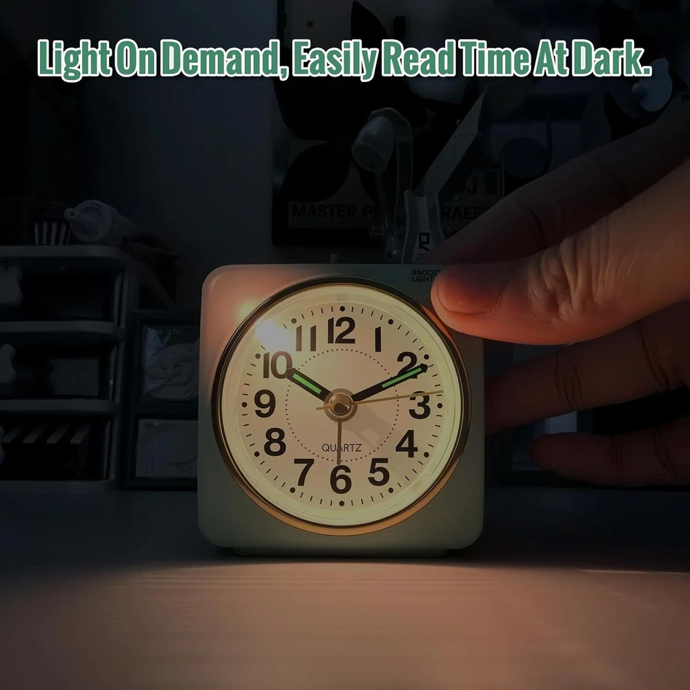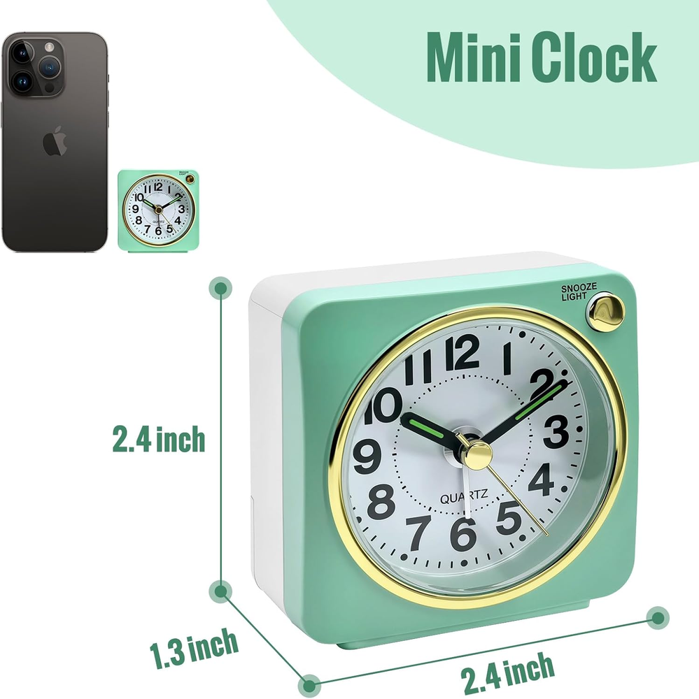 Ultra Small Alarm Clock: The small analog clock keeps perfect time. It's light- weighted, functional, easy to handle, compact, pretty, silent. The size is 2.4" x 1.3" x 2.4" , The mini size makes it perfect as a travel clock, it's easy to packed in your suitcase, pocket or bags. The little alarm clock is lightweight take up small place. Silent Clock: The quartz clock's hands sweep silently and smoothly, ensuring it won't disturb your sleep. You could put it on desk table shelf night stand end table kitchen counter bathroom shelves . Backlight On Demand: The light switch is on the front of the alarm clock, so you can press it without fumbling around when you’re half asleep. The light makes it easy to check the time at night. Assending Alarm: The gradually increasing alarm volume gently wakes you up in the morning, while the final loud and urgent ring ensures you never oversleep. The alarm clock is perfect even for heavy sleepers. Retro Design: With its vintage design and vibrant colors, it’s strikingly beautiful and works perfectly as home decor — adding a splash of color to your desk. Finally Yet Importantly: The clock is a perfect fit for the bedroom office desk living room bathroom child's room or nursery, wherever you need clear, accessible time. It suits for seniors and the elderly teenagers and adults children and kids making it a thoughtful gift for the whole family. Product description Lamisola Mini Travel Desk Analog Clock Chic small desk home decor clock This chic alarm clock isn't just functional—it's a stylish accessory. Its modern design adds a beautiful pop of color to any desk, making it the perfect decorative piece for your home or office. Multi-Function Portable Clock With its compact and durable design, this alarm clock is perfect for home use, travel, picnics, and adventures. Easily fits in your backpack or suitcase, ensuring you wake on time anywhere—from your bedroom to a campsite under the stars. Light On Demand Press the front button, you can get temporary light to read time at dark, which is very useful. Slient The quartz clock goes quiet, no ticking noise, slient for sleeping. Snooze Press the front button, you can get extra 8 min snooze. Battery operated The clock is powered by 1 AA battery, cordless, easy to take away.