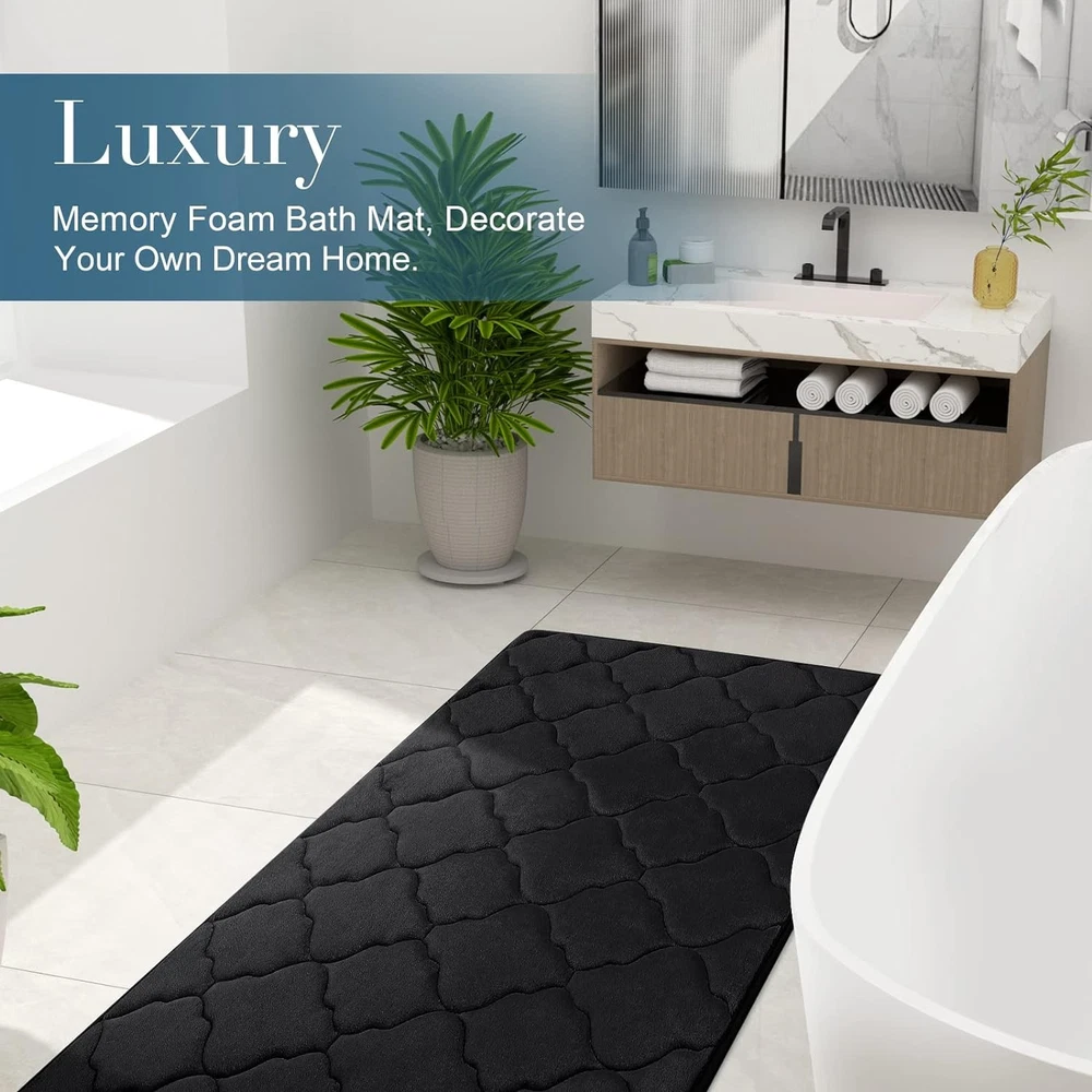OLANLY Memory Foam Bath Mat Rug 24x16, Ultra Soft and 24" x 16", Black Product Details Brand: OLANLY Size: 24" x 16" Material: Foam Weave Type: Tufed Pile Height: Low Pile Construction Type: Machine Made Back Material Type: Polyvinyl Chloride Color: Black Indoor/Outdoor Usage: Indoor Theme: Clouds Is Stain Resistant: Yes Product Care Instructions: Machine Wash Pattern: Trellis Shape: Rectangular Special Feature: Absorbent, Quick Dry Room Type: Kitchen, Bedroom, Living Room, Guest Room Style: Moroccan Occasion: New Year, Christmas, Housewarming, Birthday, Thanksgiving Number of Pieces: 1 Item Thickness: 0.7 Inches Water Resistance Level: Water Resistant Is Autographed: No Age Range (Description): Adult Product Dimensions: 24 x 16 x 0.7 inches Item Weight: 9.9 ounces Manufacturer: OLANLY [STYLISH AND CLOUD-LIKE COMFORT] OLANLY's Memory Foam Bath Mat boasts an elegant Moroccan design, infusing a touch of modern luxury into your space. Crafted from ultra-soft microfiber coral velvet outer material and thick cushion memory foam, our bathroom rug provides a cloud-like comfort that contours to the shape of your body, making every step a luxurious experience. [SWIFT DRYING BLISS] Pamper yourself with the rapid-drying comfort of OLANLY's soft velvet microfiber bath rugs, providing a delightful solution for moisture absorption after your bath or shower. Immerse yourself in the convenience of a fast-drying memory foam bathroom mat. [STURDY PVC SUPPORT] OLANLY's bathroom mat features a robust and enduring PVC backing, designed to prevent any shifting or skidding. This superior construction sets it apart from mats with rubber backing that may degrade over time. Ensure the area beneath the rug stays dry for optimal performance, and never place it on wet surfaces. [EASY-CARE VIBRANCE] Elevate your bath experience with our easy-to-maintain rugs. These machine-washable bath rugs keep their vibrant colors intact, adding a touch of brilliance to your living spaces. Incredibly easy to clean and maintain, they stay fresh even after multiple washes. The fade-resistant feature ensures the longevity of their vibrant colors. [VERSATILE LUXURY] Transform your bathroom with OLANLY's memory foam bath mat – a stylish and plush addition to your daily routine. Whether positioned by the tub, shower, or sink, savor the soft opulence underfoot and elevate your bathing experience with timeless elegance.