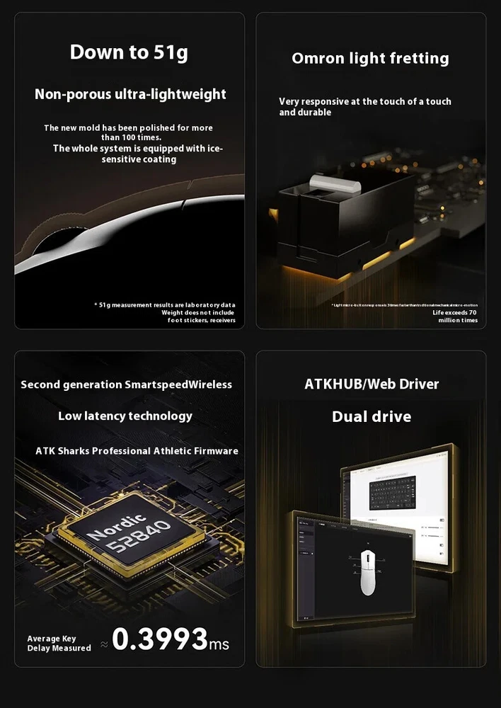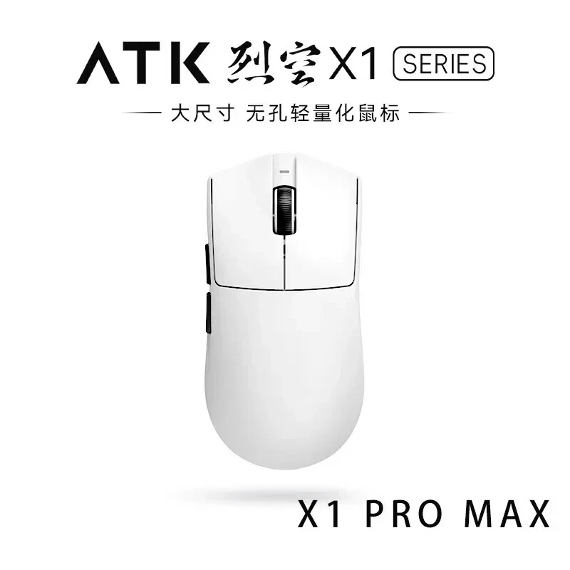 Product name: ATK Ray Sky X1 Ultimate Ultra Lightweight Wireless Mouse Color: Black/White Coating: Ice Sense Coating Sensor: PAW3950Ultra Main control chip: Nordic nRF52840 Transmission technology: Second generation Smart Speed Wireless transmission technology/ATK's professional competitive firmware Return rate: Wired 8K/Wireless 8K Battery: 500mAh Battery life: 150 hours (1000Hz) Product weight: 51g+3g (without foot pads) Main button microswitch: Omron white dot light microswitch-D2FP Side button: Huannuo Scroll wheel: F-Switch E10 flagship Foot pad: Two full-size competitive foot pads are standard Connection method: Wireless 2.4G/Type-C Dongle: Standard 8K dongle